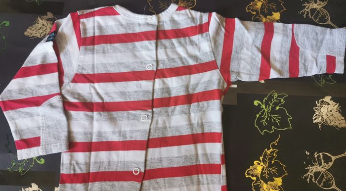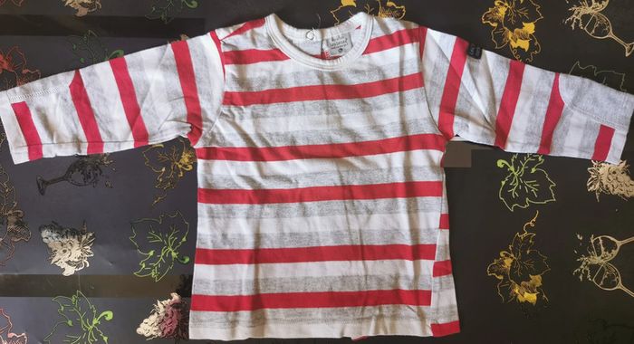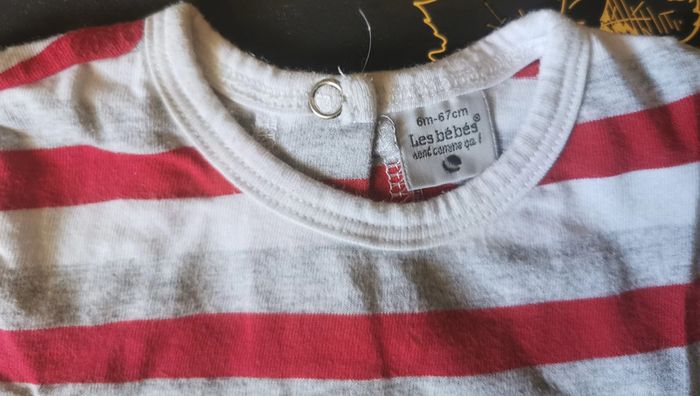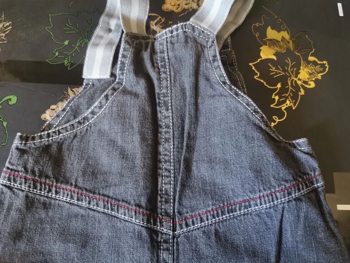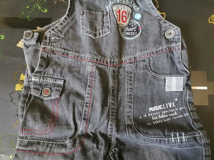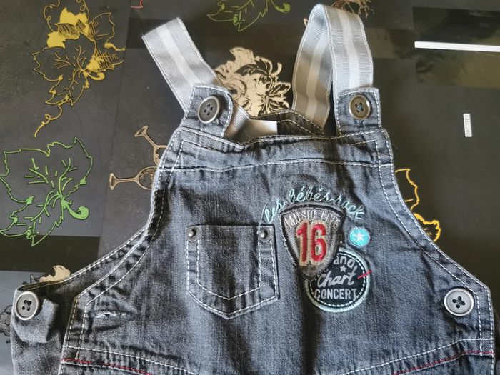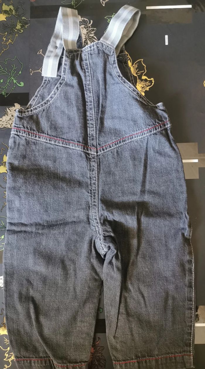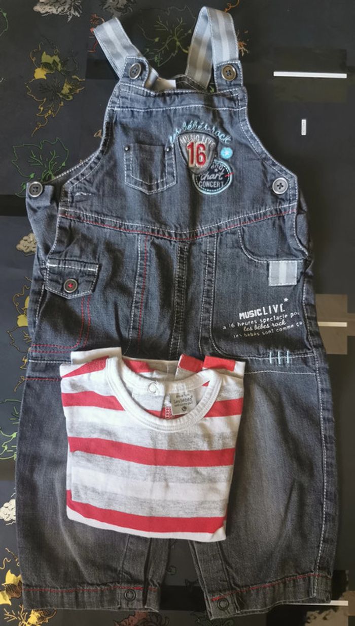 ensemble "les bébés sont comme ça" taille 6 mois. - salopette en jeans gris foncé, bretelle avec boutons, surpiqure et écussons. Boutons pressions à l'entrejambe. - t-shirt manches longues blanc, rouge et beige. Boutons pressions sur le derrière. En très bon état.