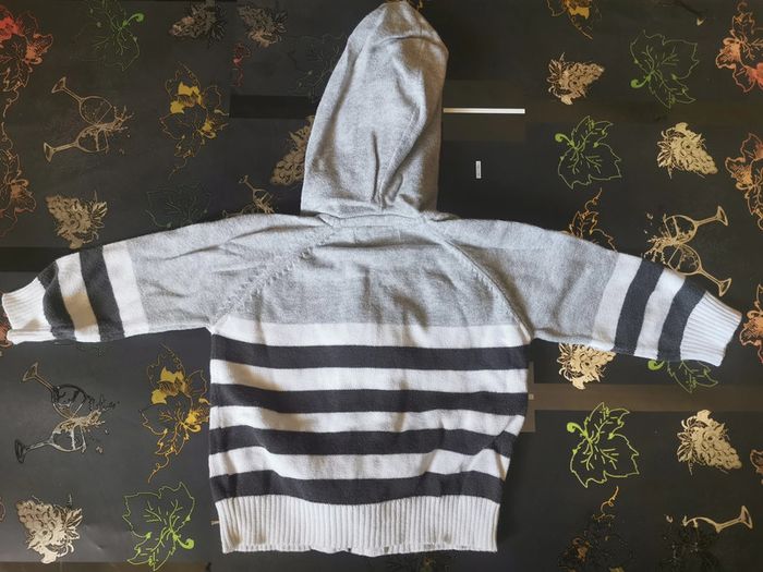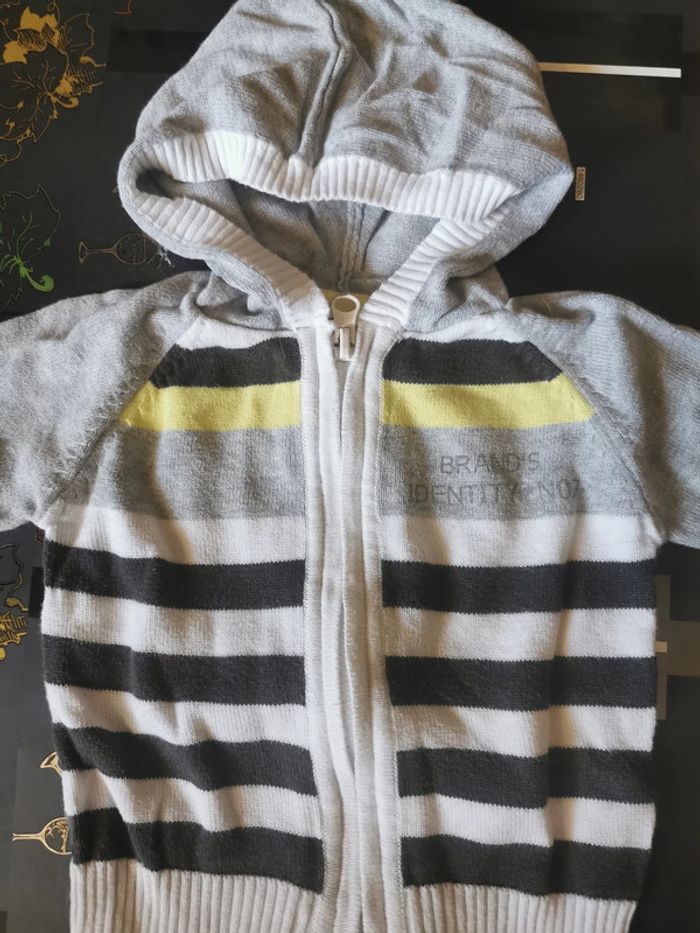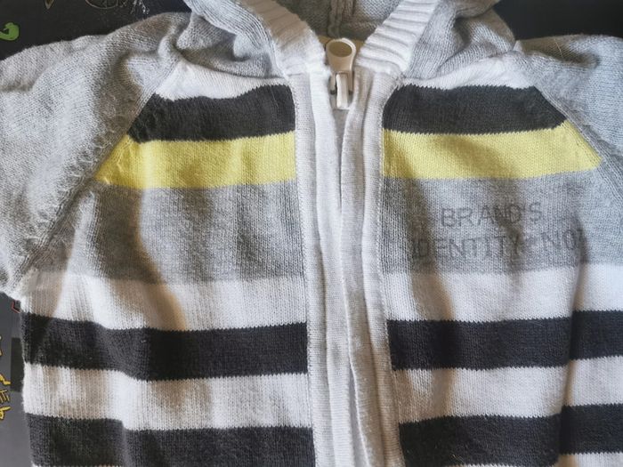Gilet " alphabet" taille 6 mois. Avec capuche. Blanc, gris et jaune rayé. Zip sur le devant. En très bon état.