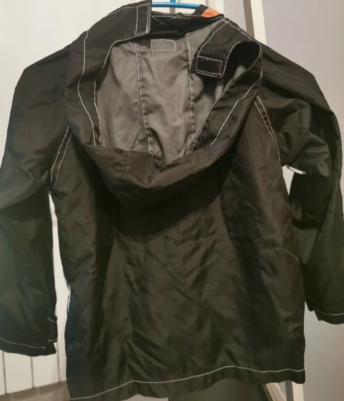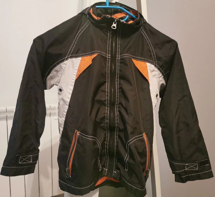 coupe vent en très bon état noir, orange et blanc "in extenso" avec capuche. Doublure aérée anti transpiration. 2 poches zippés avant.