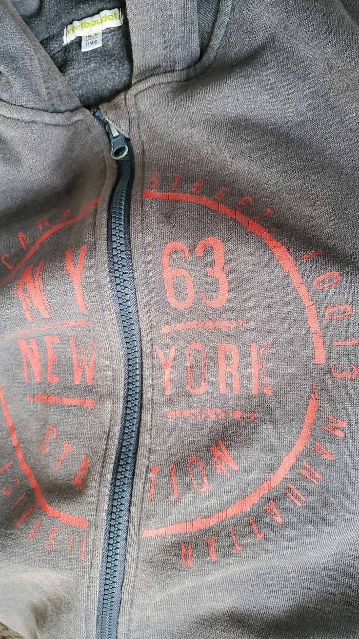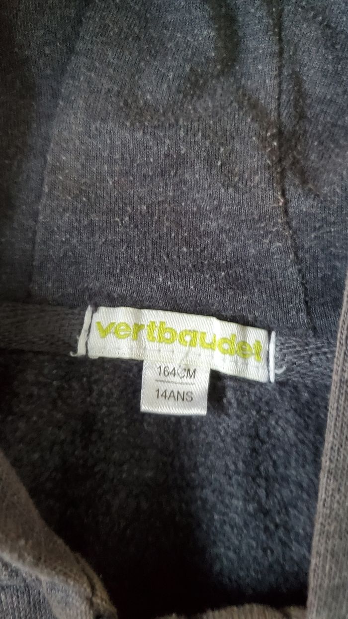 Sweat zippé avec capuche Verbaudet bleu et écritures rouges. Bon état.