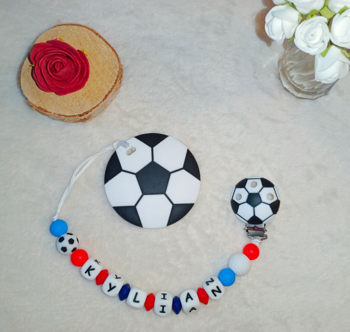 Coffret Attache tétine + jouet dentition Football en silicone alimentaire ou/et bois naturel 100% personnalisable.