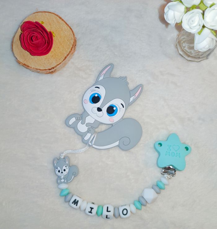Coffret Attache tétine + jouet dentition Ecureuil en silicone alimentaire ou/et bois naturel 100% personnalisable. Énormément de choix de composants, vous trouverez forcement votre bonheur et si je n'ai pas, je peux le commander. N'hésitez pas à m'envoyer un message pour que l'on crée ensemble votre accessoire idéal.