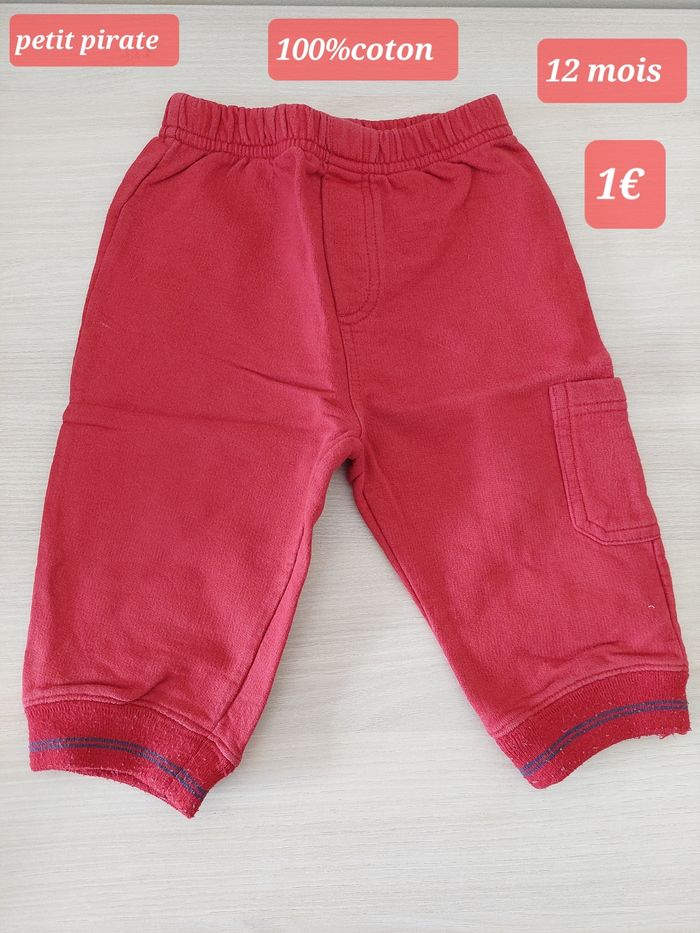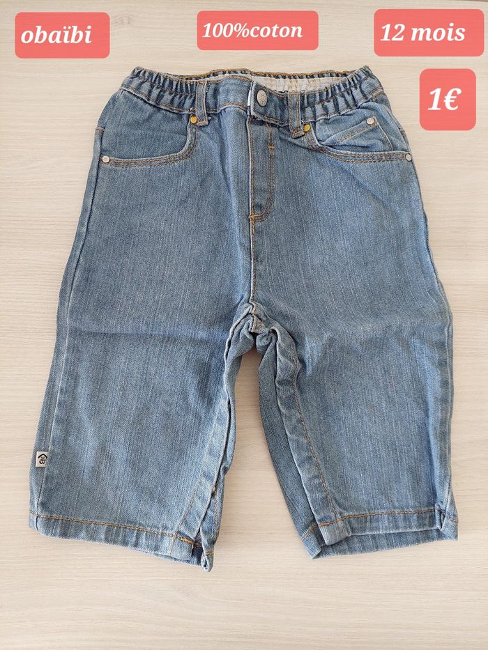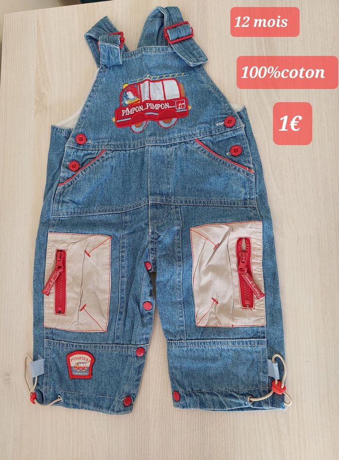 Vends 2 jeans léger. 1€ le pantalon 1 salopette. 1€ 1 pantalon de jogging. 1€ Ils sont en très bon état. Maison non fumeur. La marque et la matière sont écrits sur les photos.
