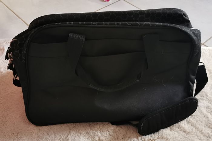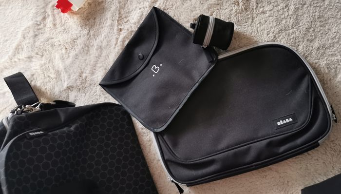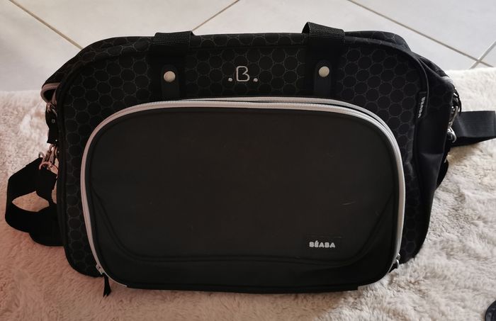 Sac à langer Béaba noir. Inclut avec le sac : - 1 petite pochette linge sale, - 1 trousse range sucette amovible, - 1 poche espace parents amovible, - 1 sangle amovible réglable, - accroches poussette. Comme neuf, très peu utilisé.