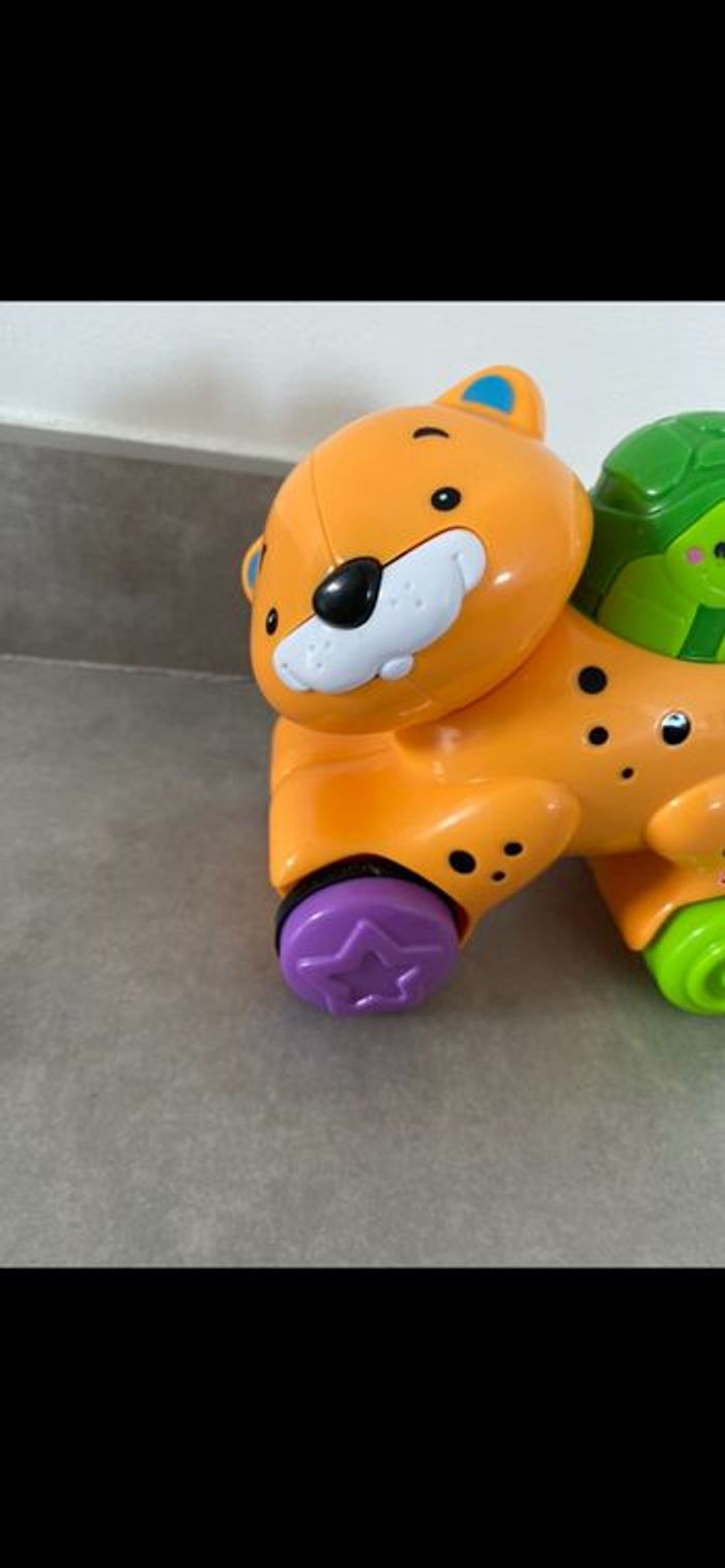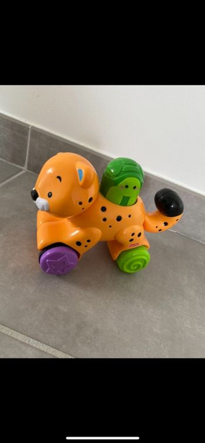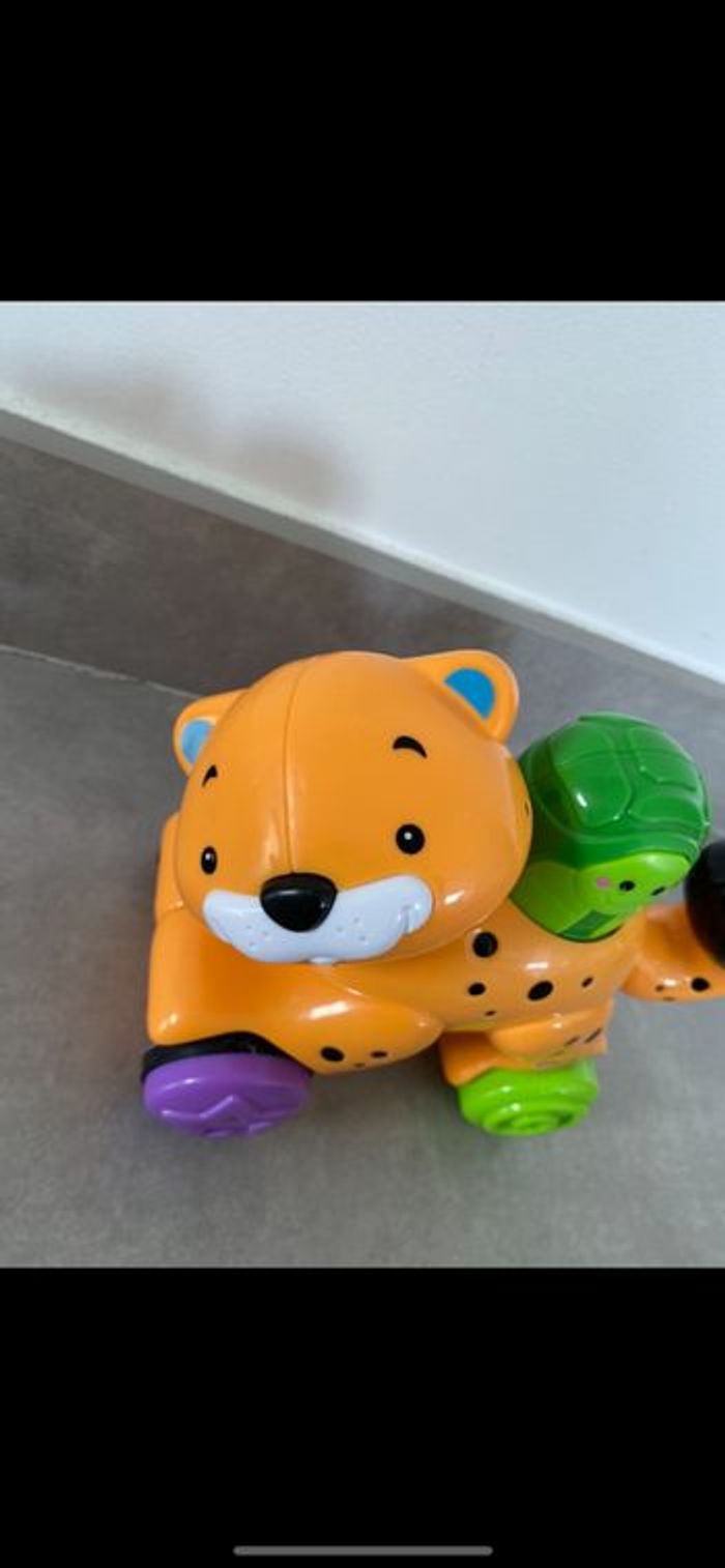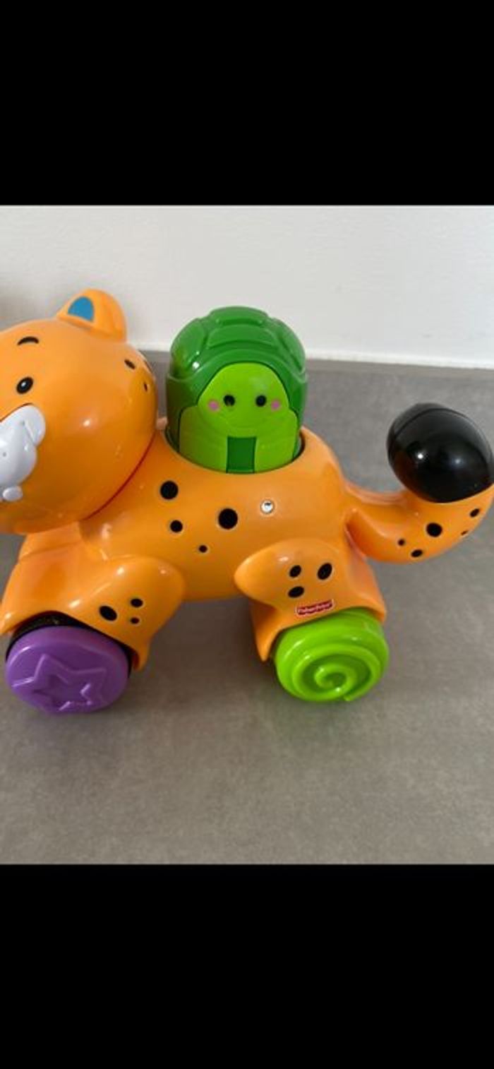 Tigre à roulette qui fonctionne par pression. Il faut appuyer sur la tortue pour qu'il avance tout seul! Doublon donc neuf. Super drôle. N’hésitez pas à me suivre car encore beaucoup de vêtements fille (du 1 mois à 8 ans), des vêtements garçon (du 1 mois au 12 mois pour le moment ). Beaucoup de 18 mois à poster si besoin j’envoie des photos. Des chaussures. Énormément de jouets et livres. Maison non-fumeurs et sans animaux même si je les adore. Il n'y aura pas de poils ou d'odeur désagréable. Vous recherchez quelques choses, demandez moi. Je réponds très rapidement. Bon shopping 😊