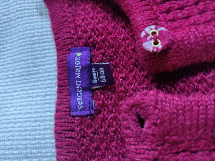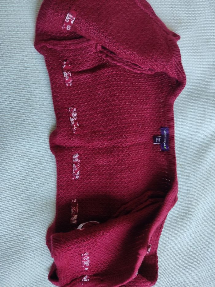 Gilet court bébé, taille 68cm, marque sergent major, couleur rouge. Fermeture a l'avant par boutons. Différents motifs feuilles. Très bon état