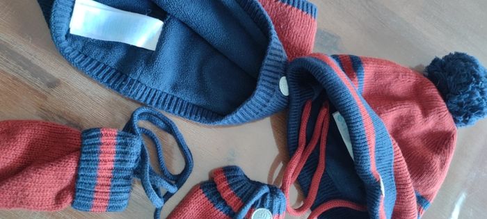Ensemble tour de cou moufles et bonnet Bordeaux et bleu marine Très bon état Marque obaibi Convient du 1 an aux 2 ans