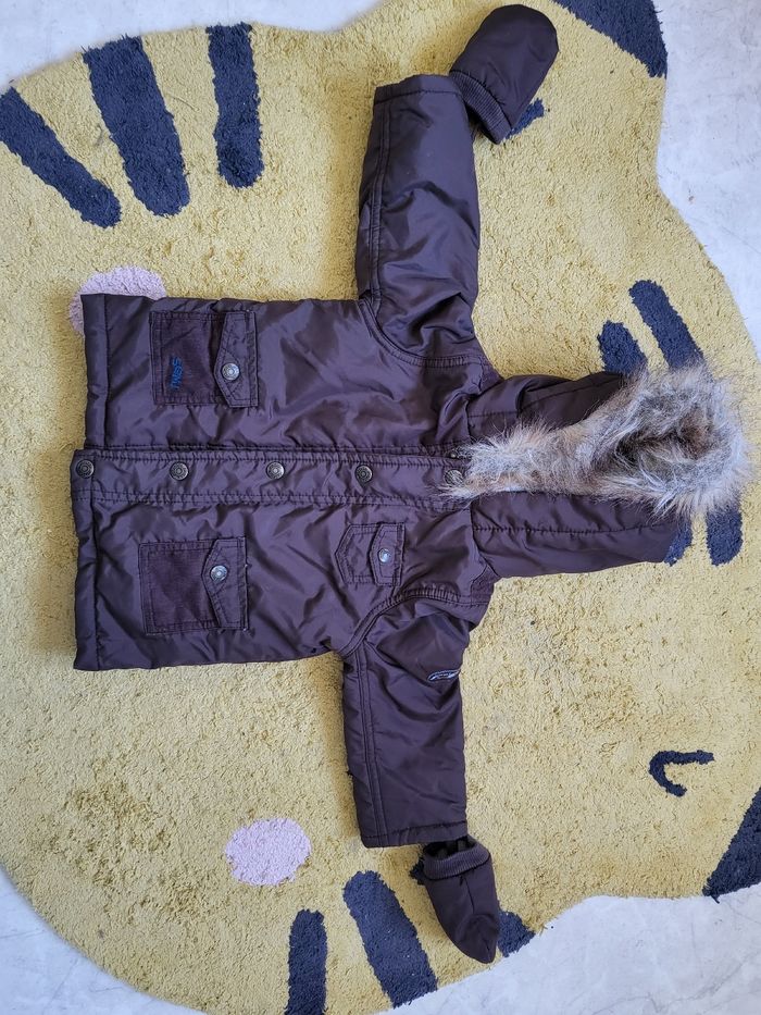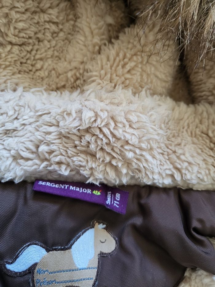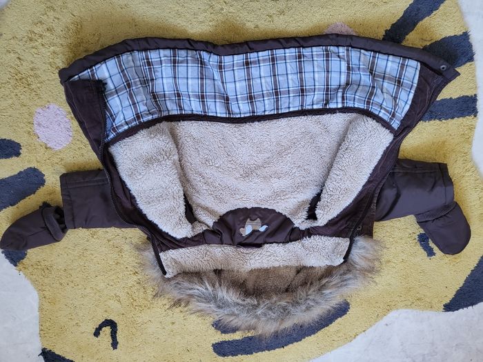 Manteau sergent major 9 mois Fourré capuche et dos Moufles Fermeture éclair et bouton Bon état mais il manque le petit crochet sur la fermeture éclair ( voir photo ) qui doit pouvoir se rajouter. D'autres articles dans mon dressing.