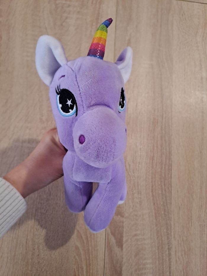 Licorne violette. Se lave à la main. J'ai passé un coup de Lingettes je conseille de le laver à la main avant de le donner à l'enfant.
