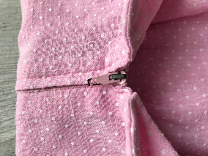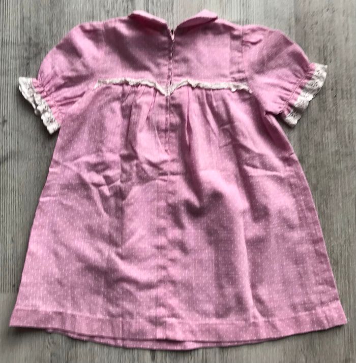 robe à manches courtes ancien modèle taille 2-3 ans (sans étiquette) couleur rose à pois blancs peinture écaillée sur la fermeture (voir photo) occasion, bon état