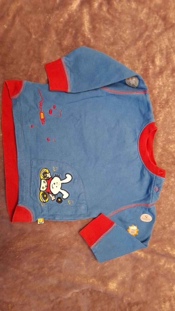 Pull bleu et rouge, petits lapins, pressions à l épaule.