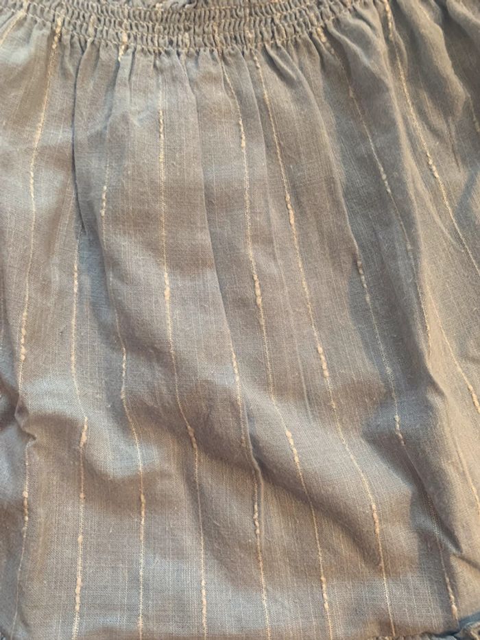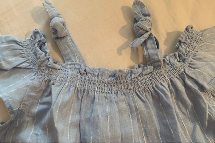 Blouse élastique aux épaules avec bretelles , plissée , bleu clair , petites rayures blanches . Taille 5 ans , marque Orchestra .