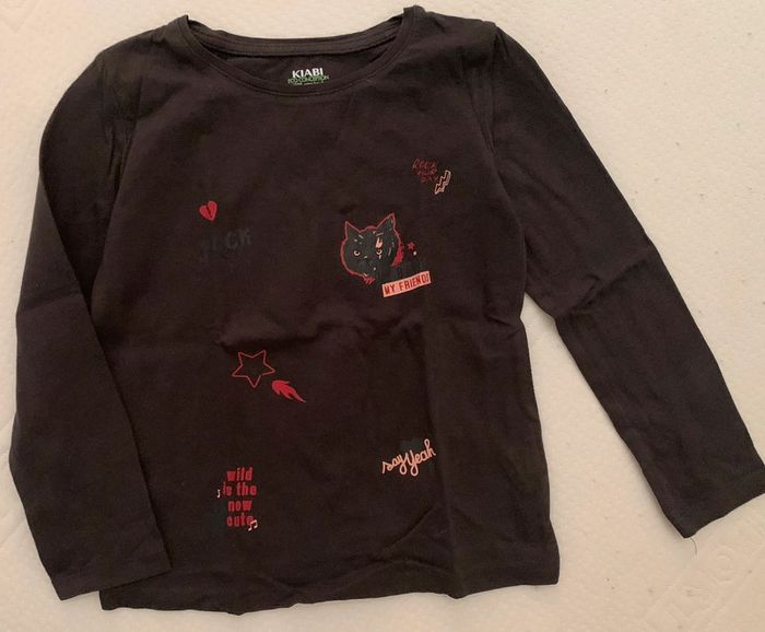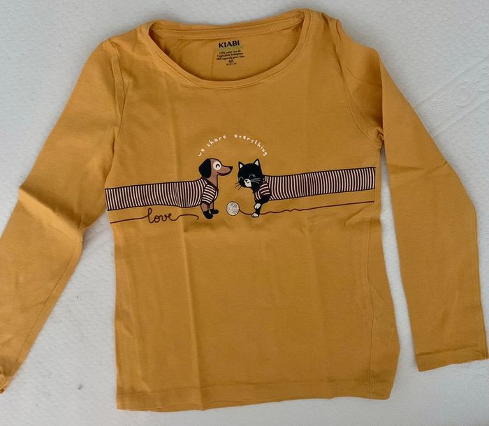 Lot comprenant 1 teeshirt ML moutarde et 1 tee-shirt ML noir . Taille 4 ans , marque Kiabi