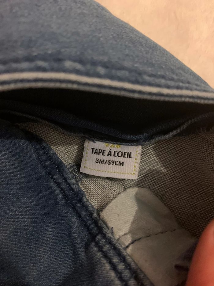 salopette en jean elasthanne, taille 3 mois , Marque tape à l œil . Le côté très pratique pour le change avec l ouverture pressions au niveau de l entrejambe . Comme neuve