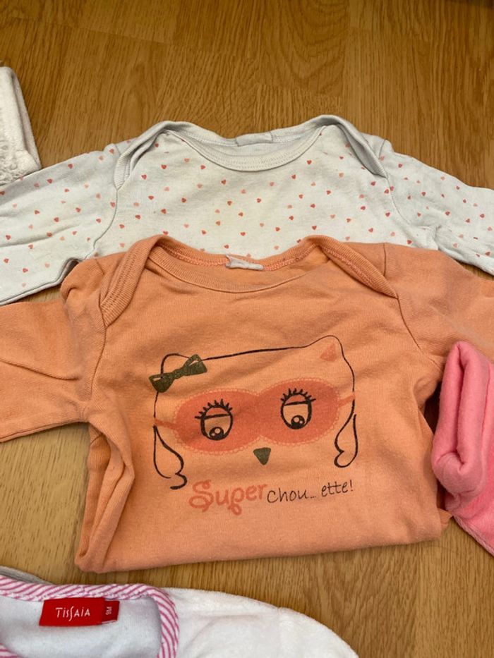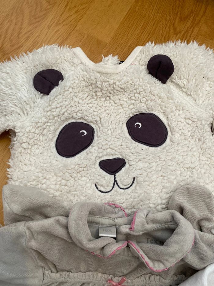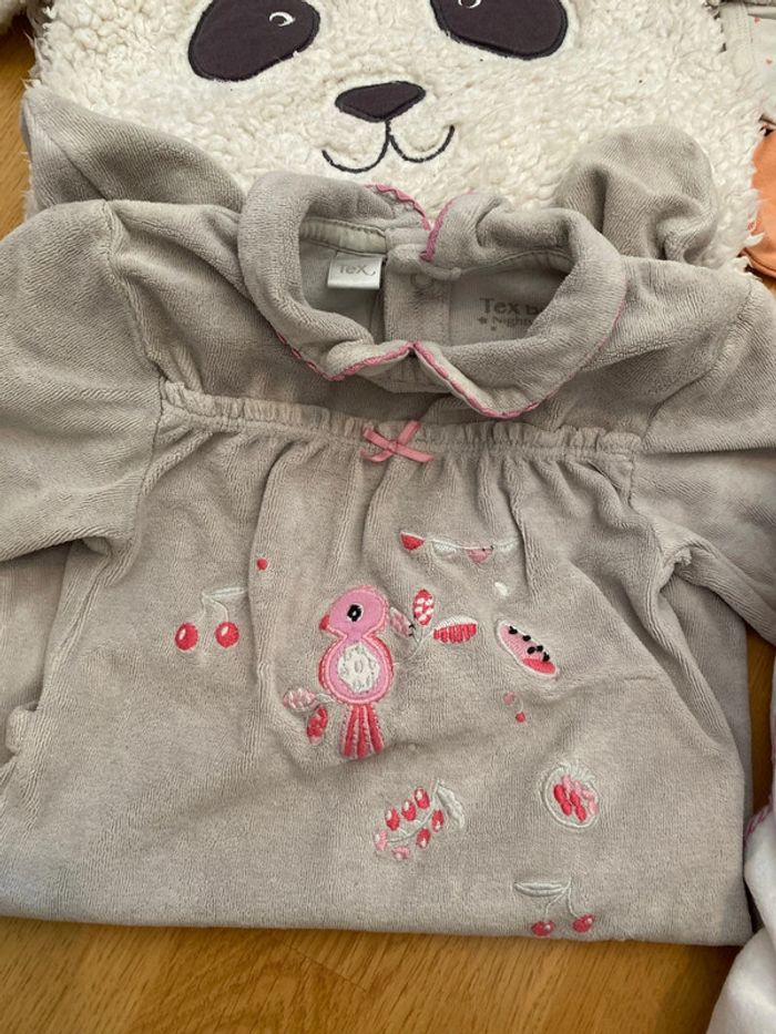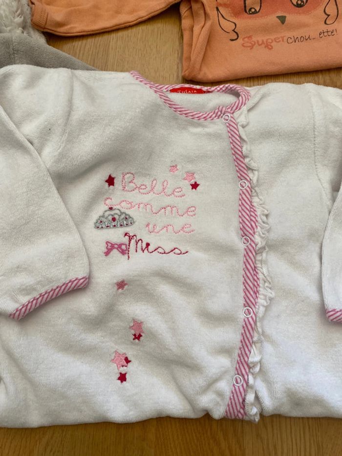 Comporte : -3 pyjamas hiver -1 sweat très chaud et épais neuf -2 bodies manches longues Le tout en très bon état. (Juste un des deux bodies comporte des traces d’usure mais pas de trous) Divers marques.