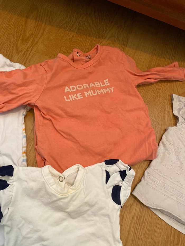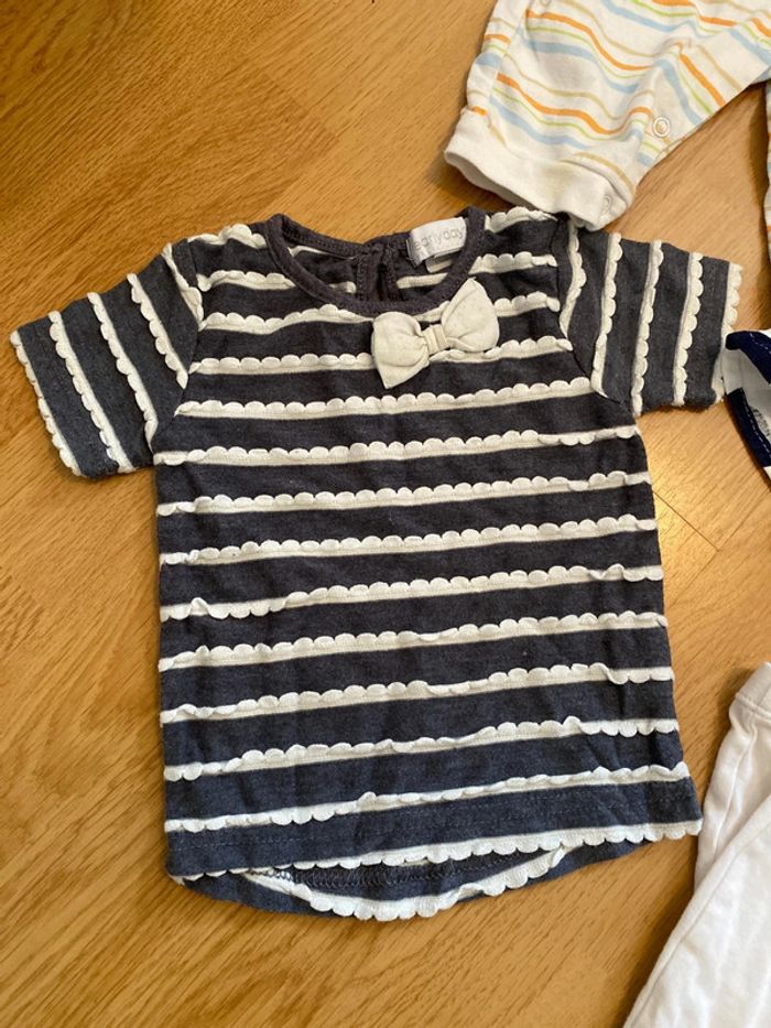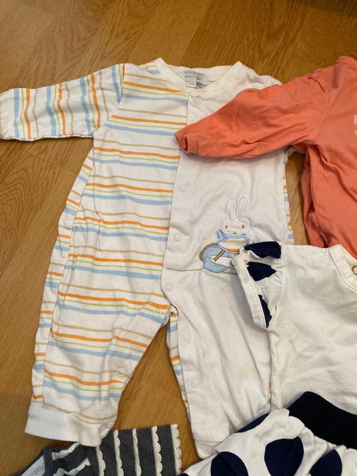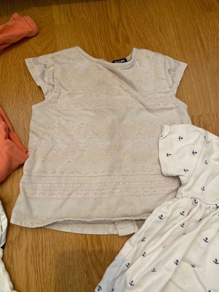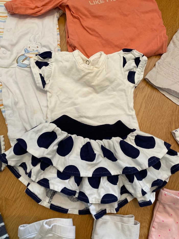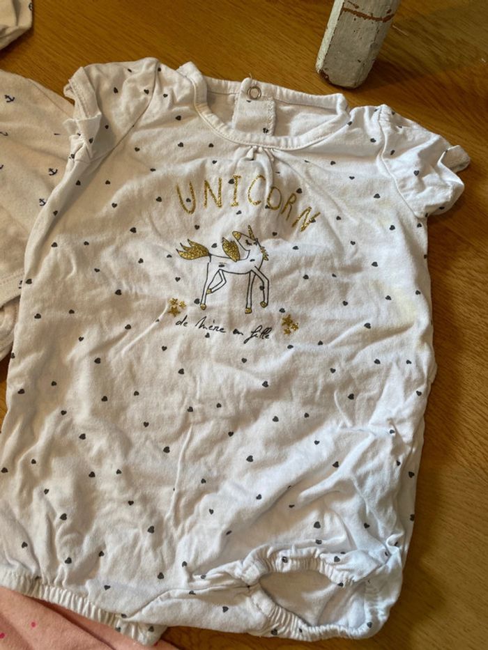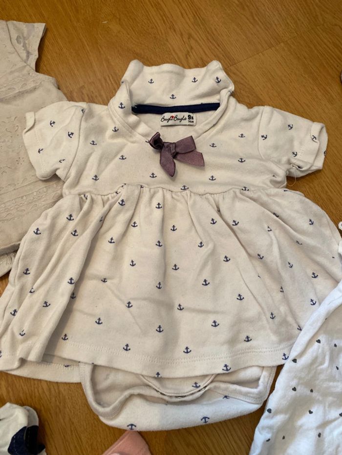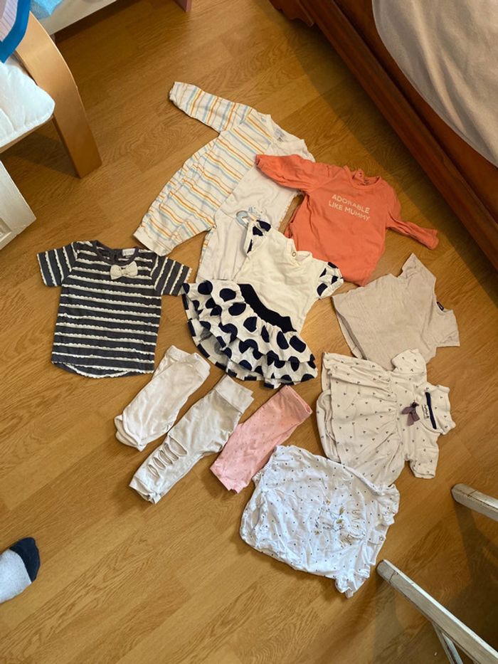 Comporte : -1 pyjama léger -2 combishorts -2 tshirts -3 leggings courts -1 robe bodie 2 en 1 -1 ensemble bodie + jupe 4 des 11 pièces sont en état satisfaisant car minis taches jaunâtre (peu visible, voir photo) mais je les donne donc. Divers marques.