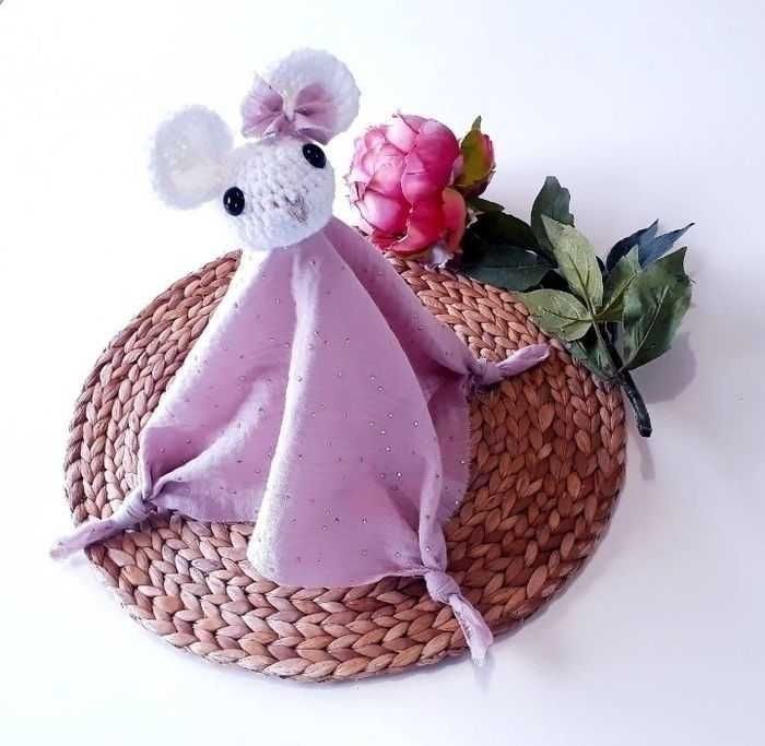 Jouet peluche doudou mouchoir animaux souris fait main crochet gaze de coton à pois dorés bébé naissance