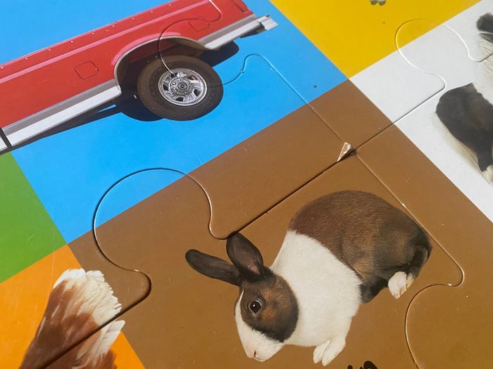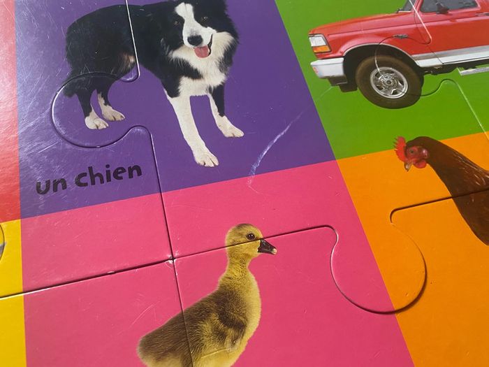 Puzzle de 90cm par 70cm environs. Complet mais comporte quelques éraflures et abîmé à quelques endroits (cf photo)