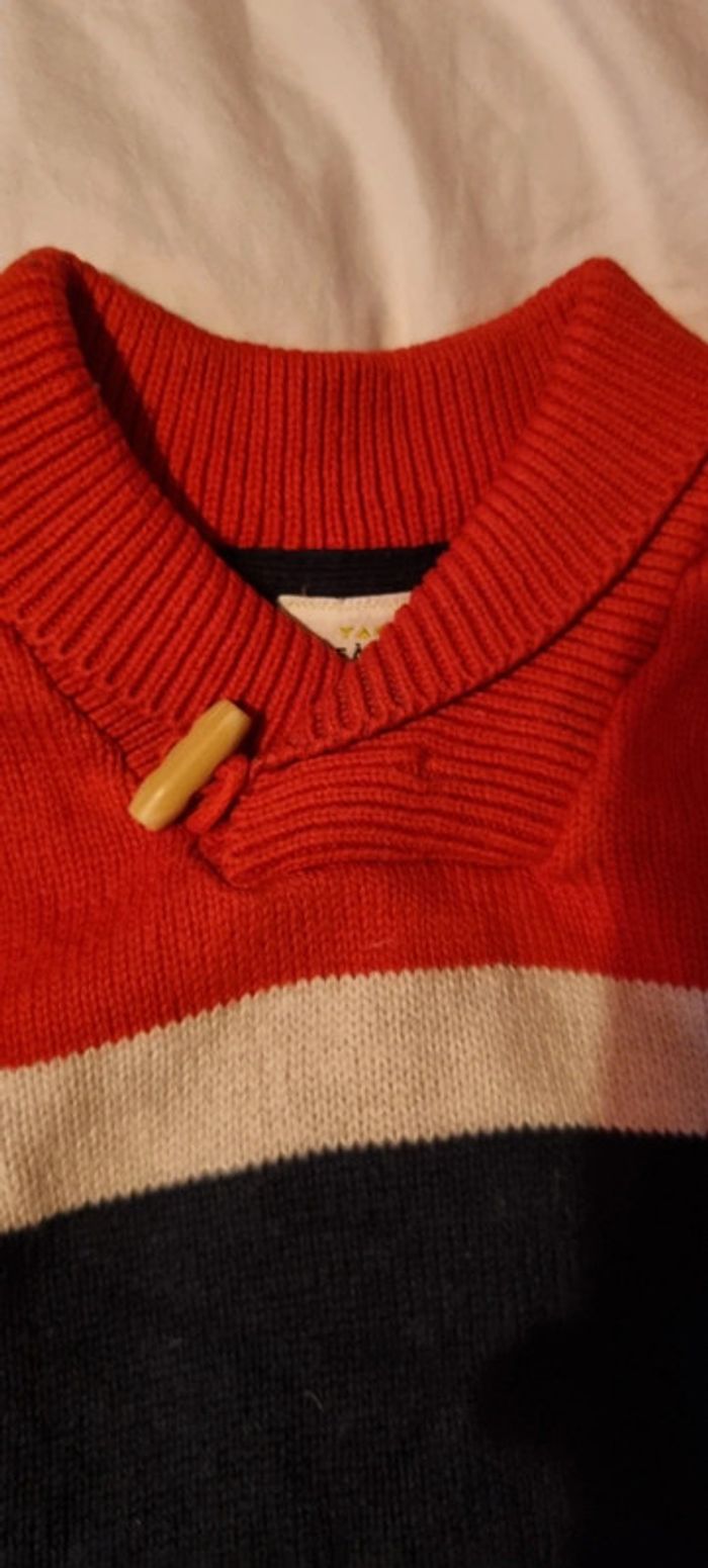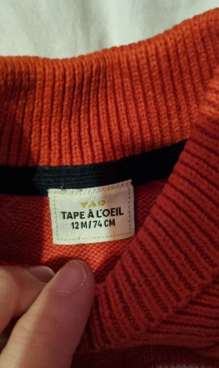Beau pull d'hiver 12 mois. TAO. Très bon état. Rouge-orangé, beige et bleu marine.