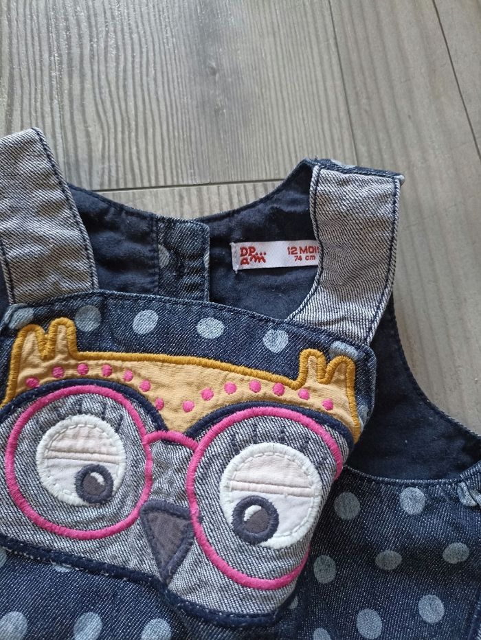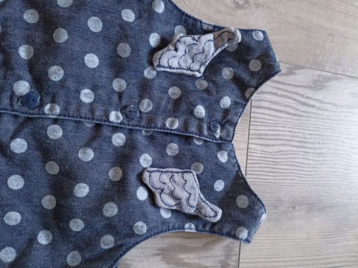 Très belle robe en jeans avec petites bretelles Yeux et motifs petit point. Petites ailes déco sur l'arrière pour le plus bel effet. Avec collant blanc Marque dpam