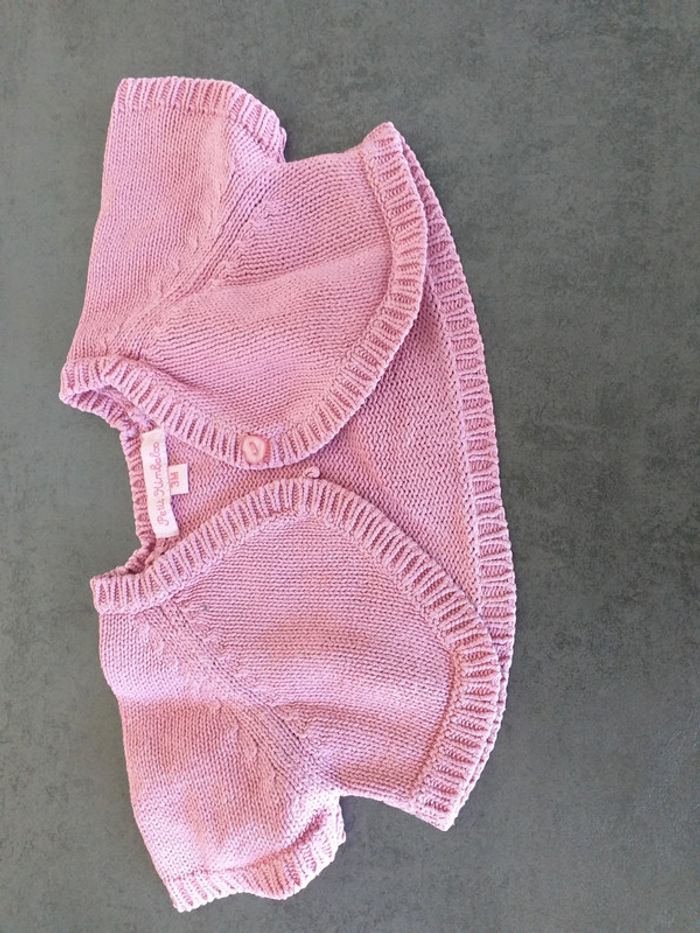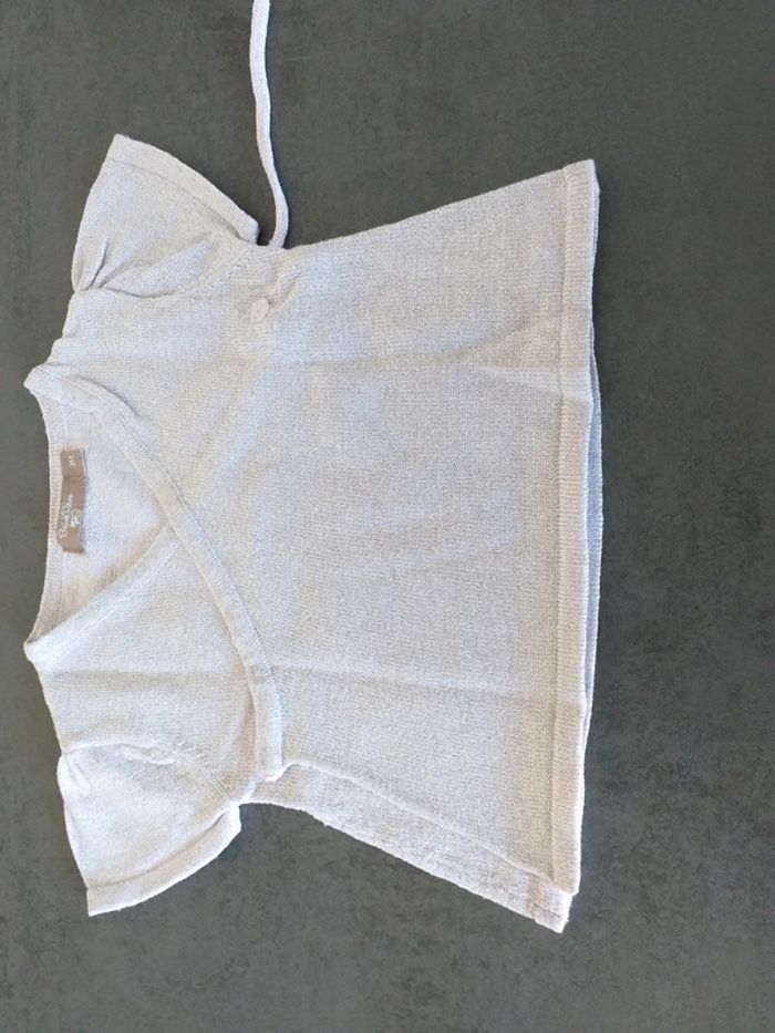 Lot de 2 Gilets fille le gris a des fils argentés qui rendent le gilet brillant et un gilet court rose. Taille 3 mois . Bon etat. N'hésitez pas à regarder le dressing plusieurs 3 mois !!!