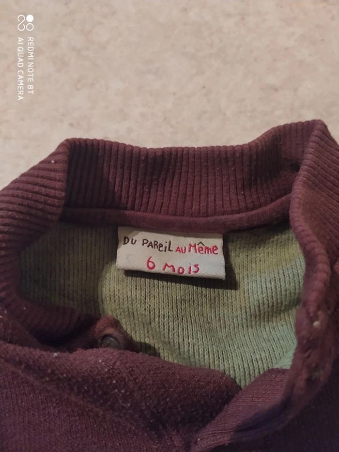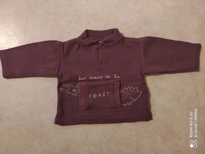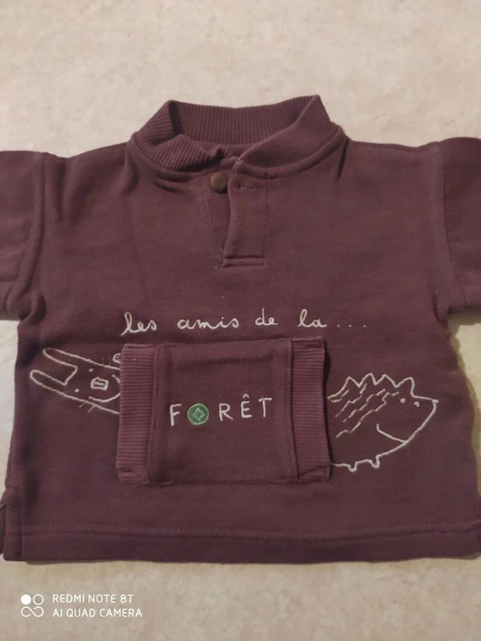 Pull marron 6 mois Inscription : les amis de la forêt Petite poche sur l'avant Petit bouton sur le haut Marque : Du Pareil au Même