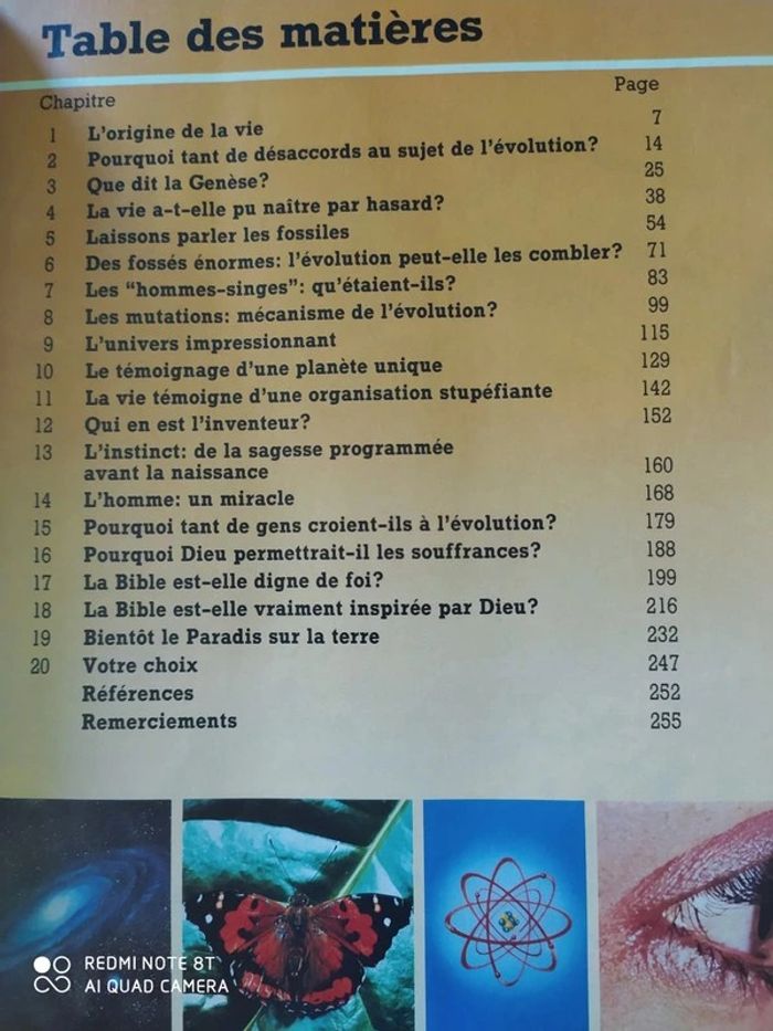 La vie : Comment est-elle apparue ? Évolution ou création ? 251 pages Table des matières dense. Livre développé sur chaque sujet Livre avec de nombreuses références. Liste des références par chapitre à la fin du livre Publié en 10 langues : 5 000 000 d'exemplaires au total En parfait état