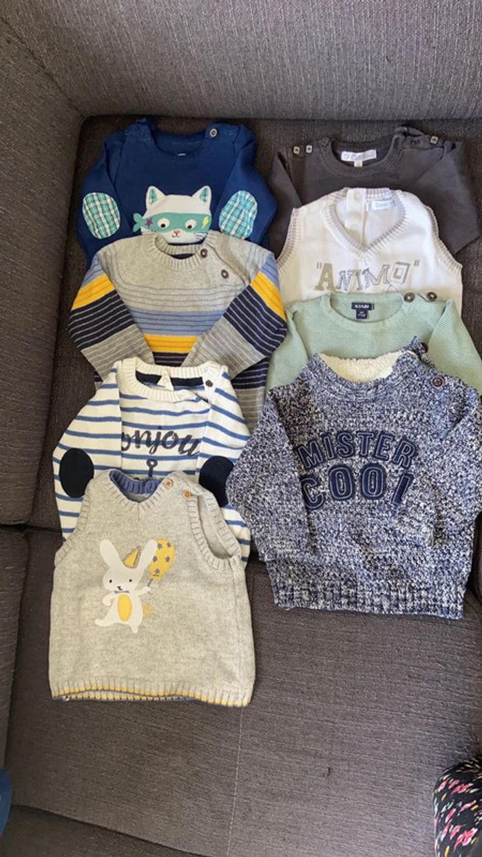 8 pulls 6 mois dont 2 sans manches 2 pulls sergent major 2 h&m 1 gemo 1 kitchoun 1 kiabi 1 canari baby