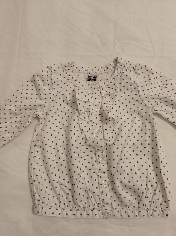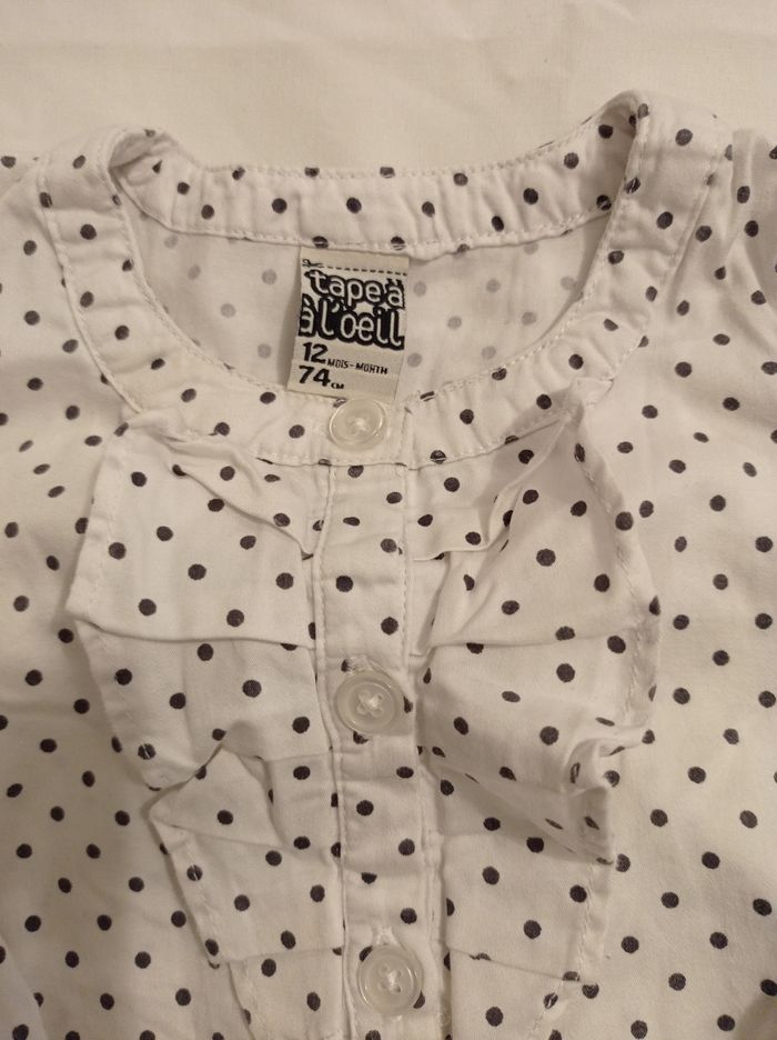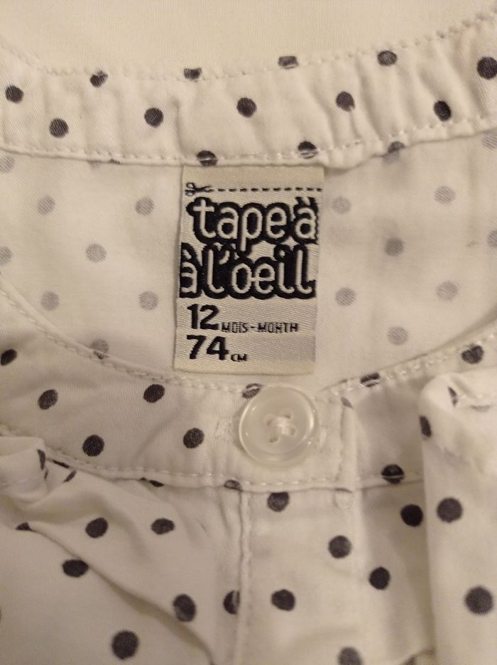 Tunique pour fille couleur blanc petit pois noir marque tape à l'oeil taille 12 mois 74 cm bouton devant avec petit dentelle voir photos - photo numéro 1