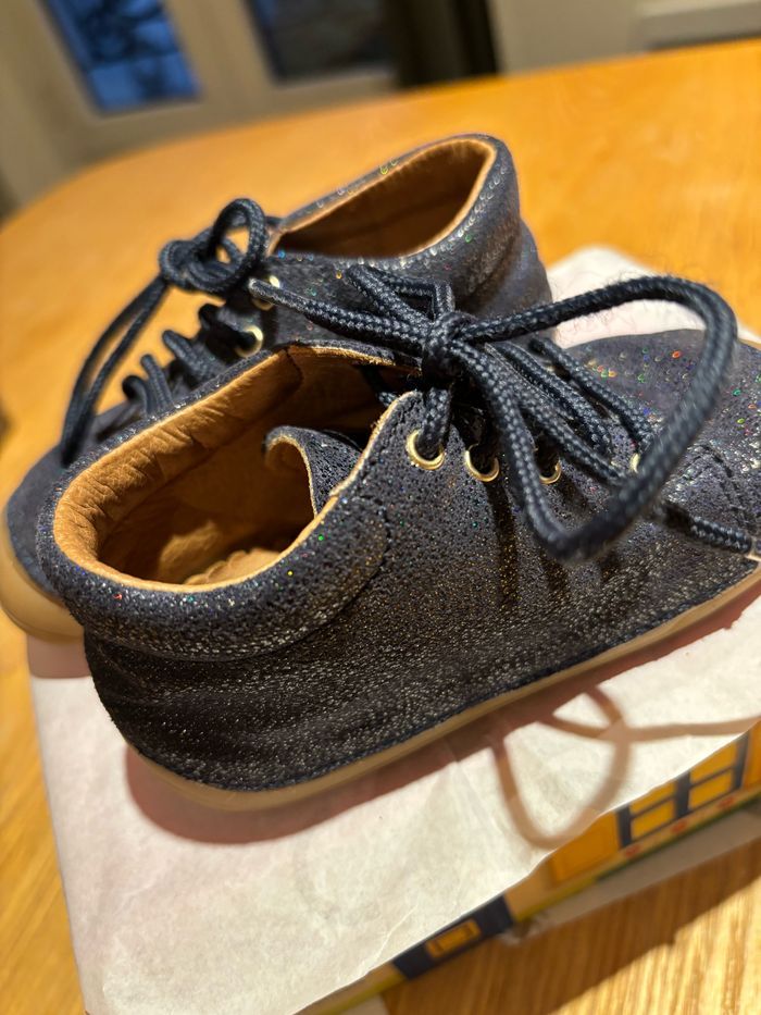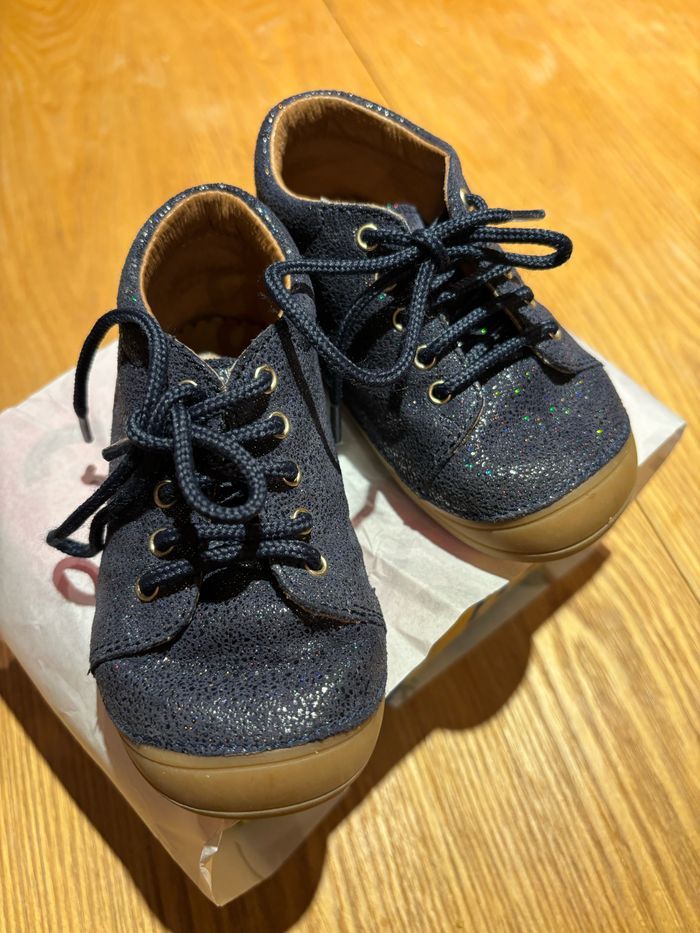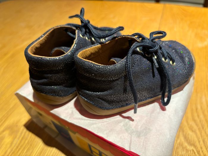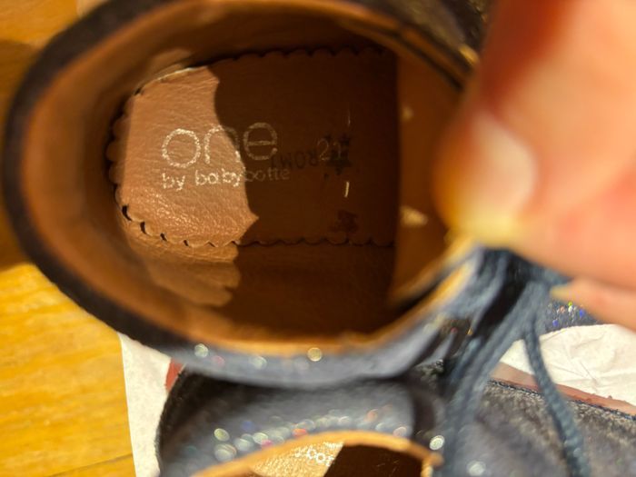 Chaussure bébé Marque Babybotte Portée 3 semaines seulement car doublon Il y le prénom Romy marqué sur la semelle intérieur (raison crèche) En cuir Bleu marine à paillette Très souple Achetée 70€ neuve