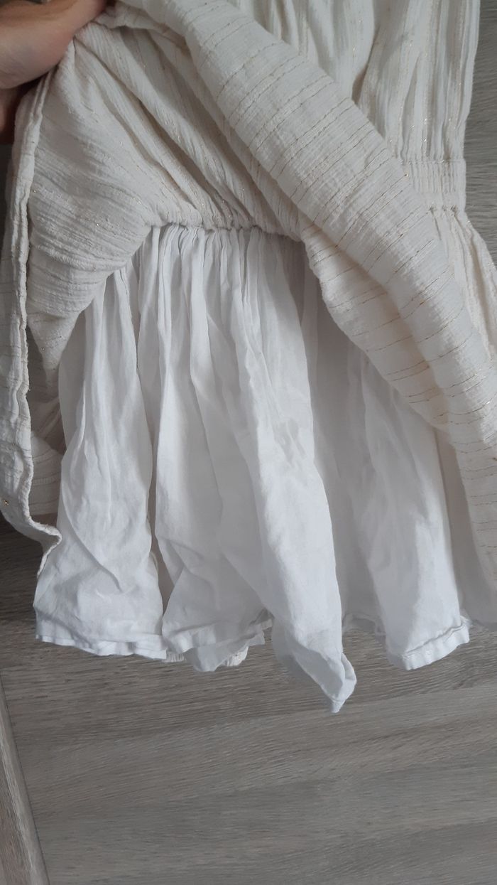 Robe blanc cassé avec fils dorés. Bon état général, quelques taches sur le haut. Doublure à l'intérieur.