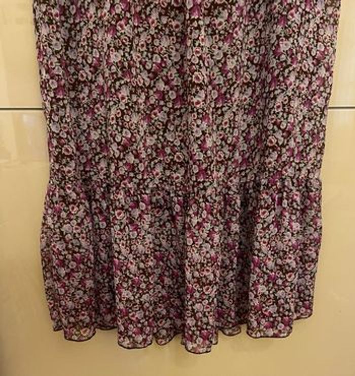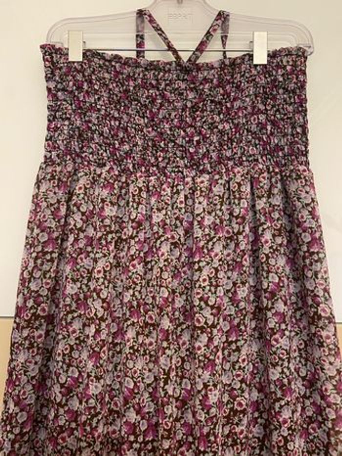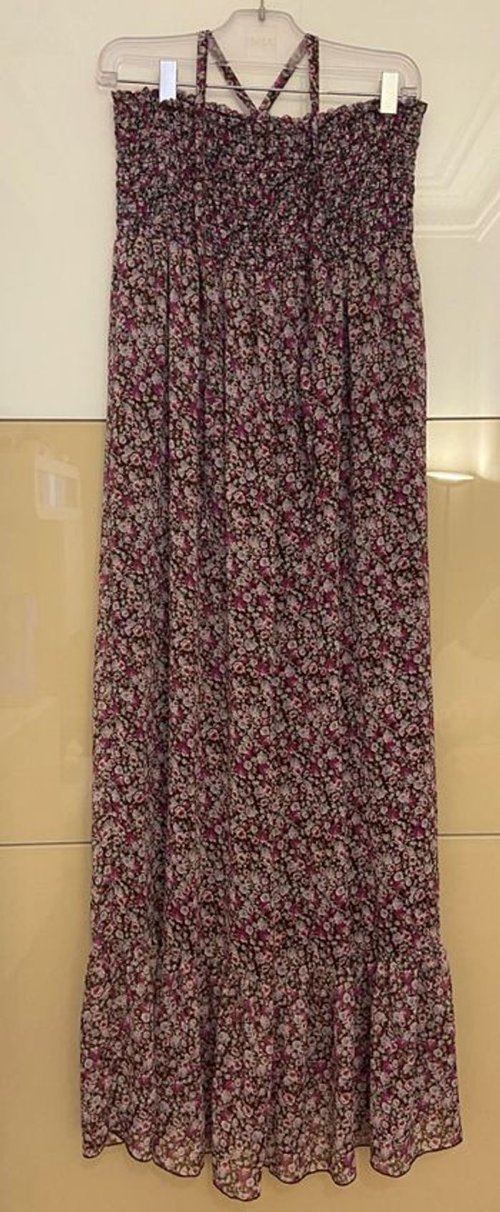 Robe longue marron imprimé fleurs parme Porté en bustier smoké ou noué sur le cou Longueur 130 cm Doublée Polyester
