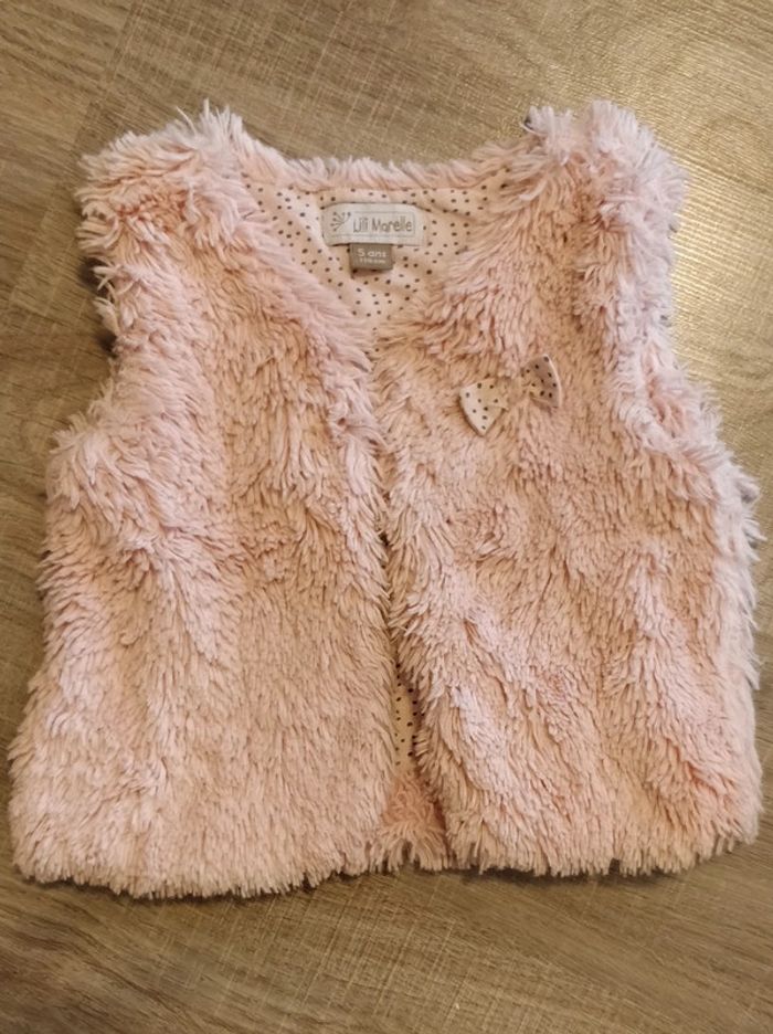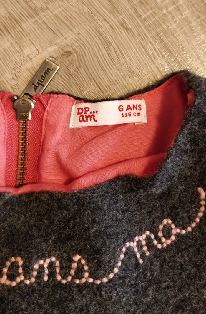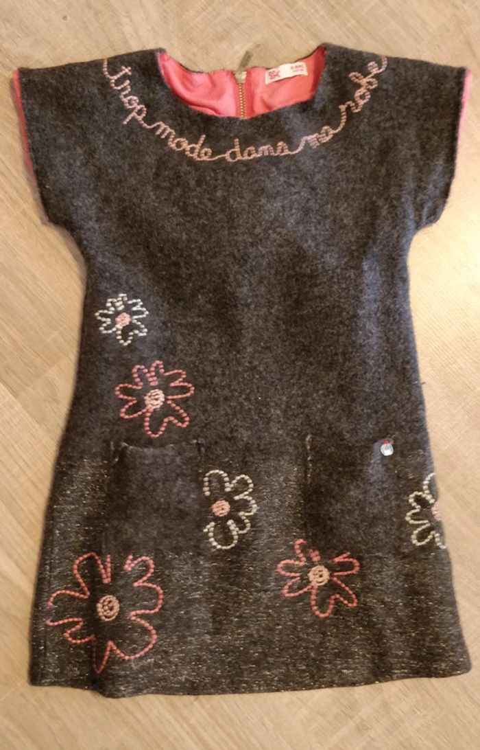 Robe chasuble grise et rose en laine feutrée. Taille 6 ans mais petite : je l'affiche en 5 ans. La robe est en laine doublure polyester + coton. Vendu avec gilet sans manche rose poudré. Le gilet est en polyester, intérieur coton. N'hésitez pas à visiter mon dressing, je fais des prix sur les lots.
