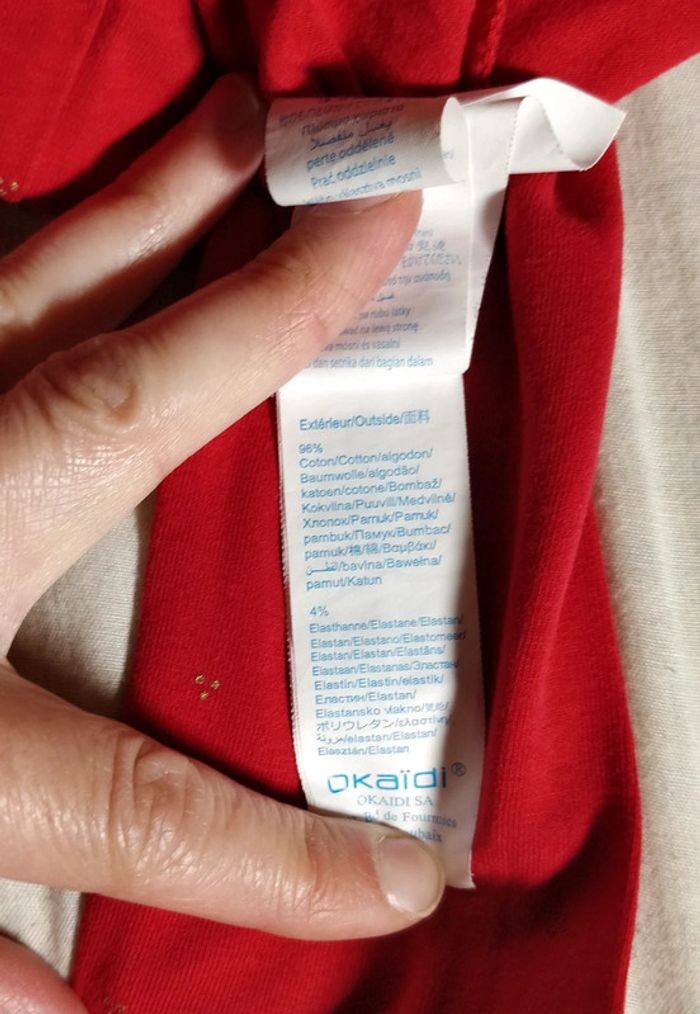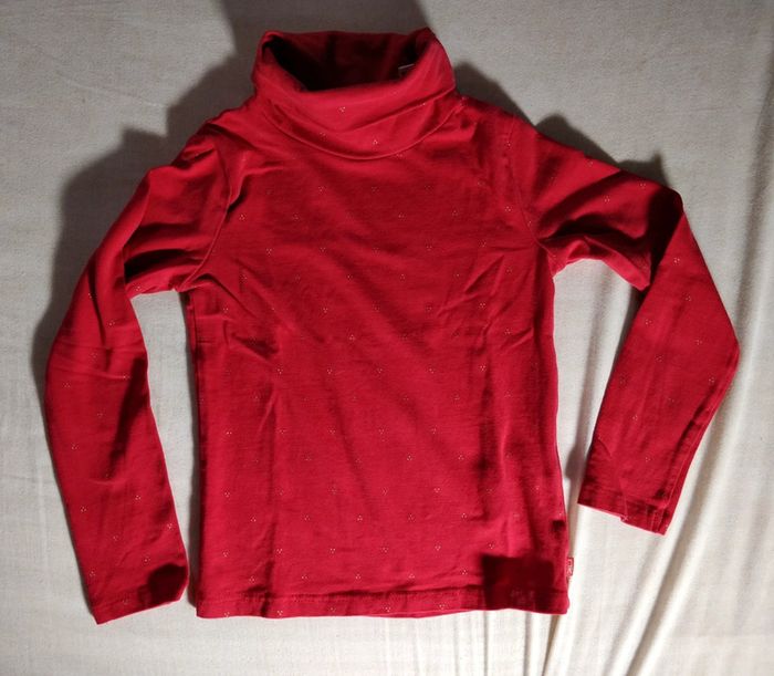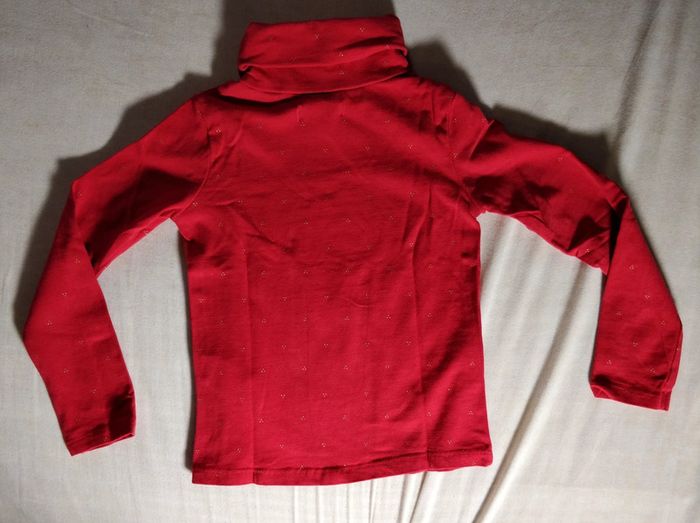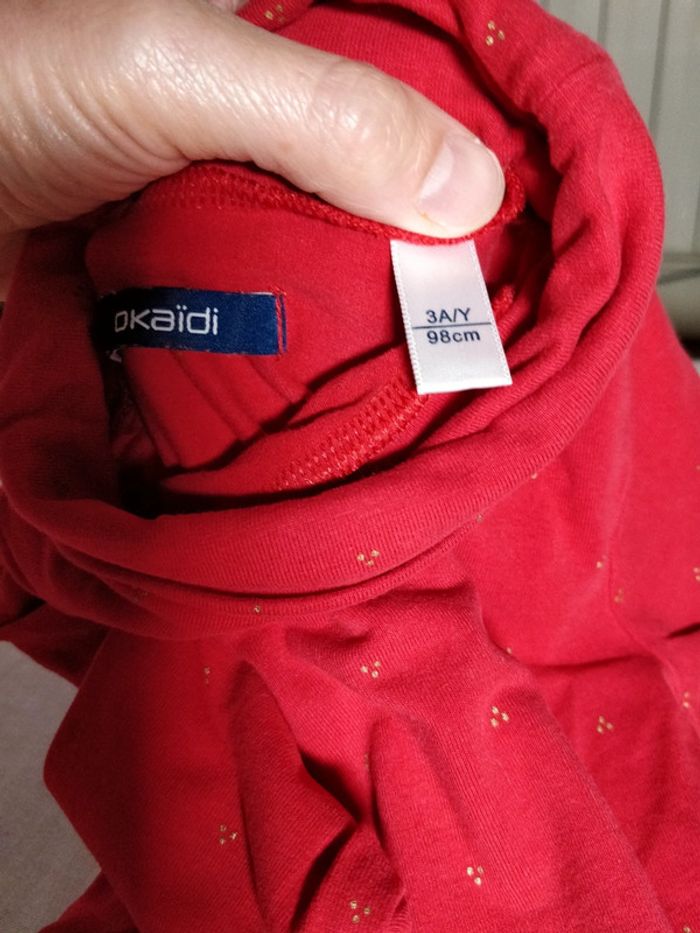 T-shirt à manches longues et col roulé, rouge à petits points dorés, taille 3 ans. Je trouve que les photos ne rendent pas du tout justice au rouge qui n'est pas du tout orangé mais tire plutôt sur le framboise. Article acheté trop tard en saison : peu voir pas porté.