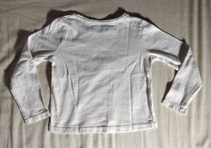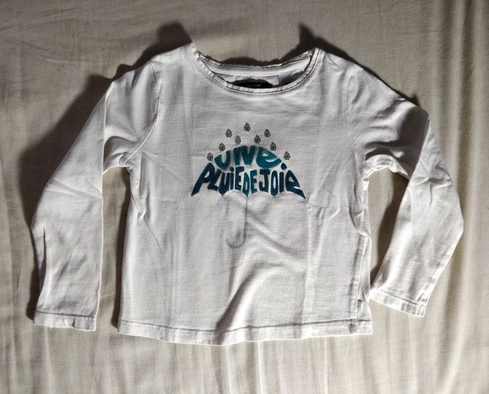 T-shirt manches longues blanc, 3 ans. Motif parapluie turquoise et gouttes de pluie en sequins. L'écriture du parapluie a un toucher velours. Bon état.
