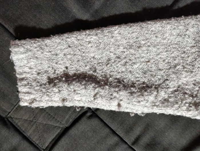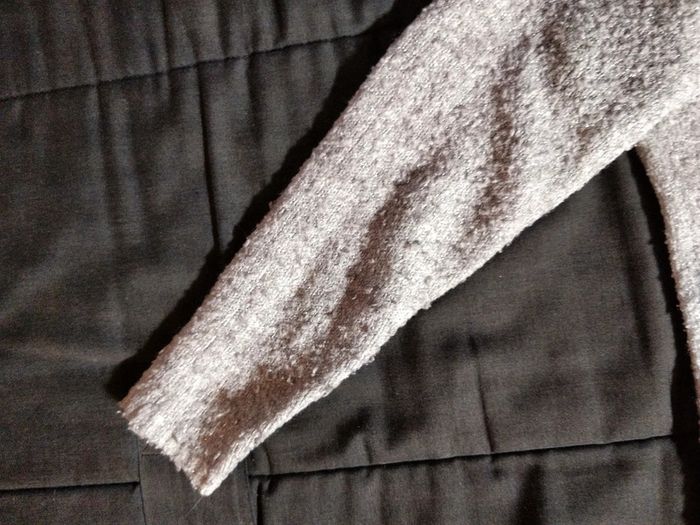 Gilet boutonné avec une maille élastique, effet paillettes argentées. 57% acrylique, 21% polyamide et 14% polyester. Très confortable et donc pas mal porté. Reste correct : la maille a boulochée, cf photos des manches.