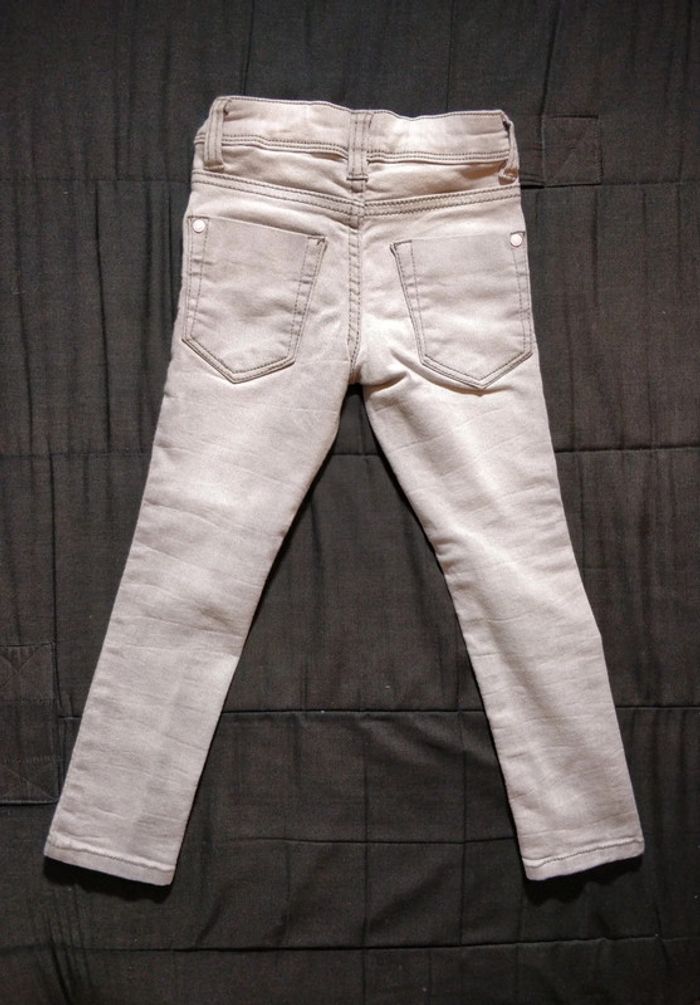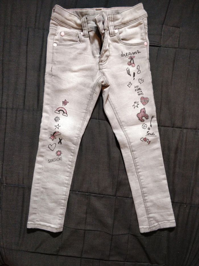 Jean slim gris avec motifs roses, taille 3-4 ans (104 cm). Peu porté. Attention jambes fines.