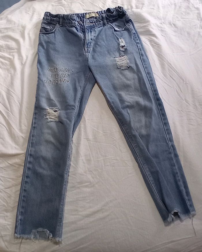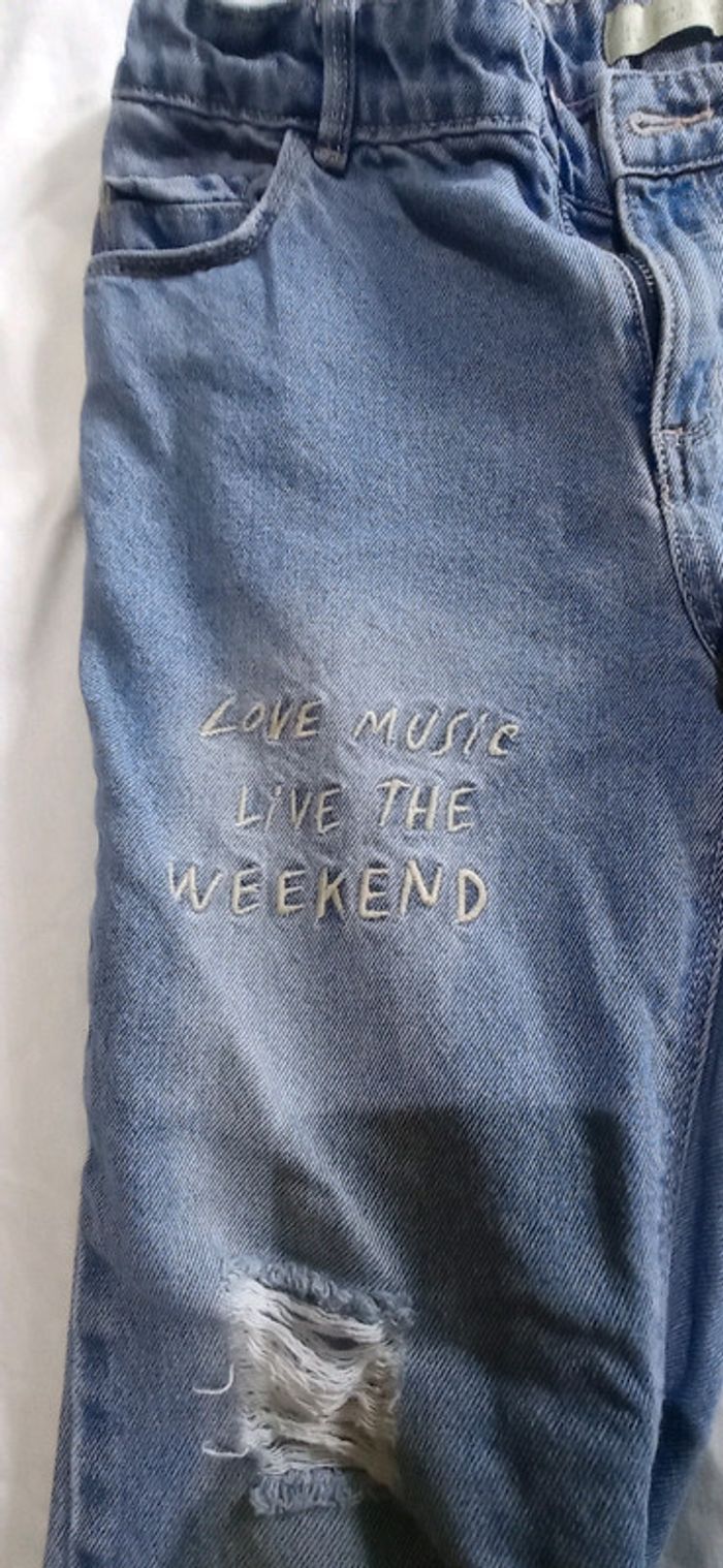 Jean fille a trous d'origine et motif "love music Live the weekend"