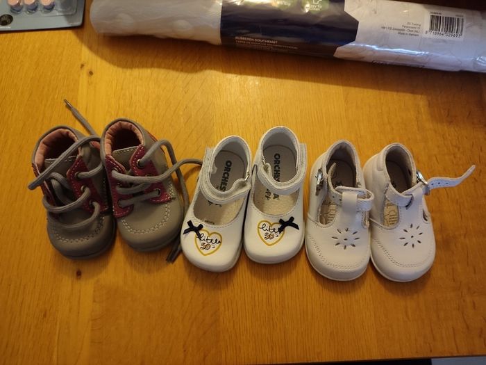 3 paires de chaussures bébé fille taille 17. Les chaussures fermées sont neuves jamais porté. Elles sont toutes en bon état et en intérieur cuir.