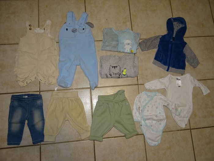 lot 1 mois garçon pantalon, body, gilet, salopette, pyjama en très bon état différentes marques 15 euros