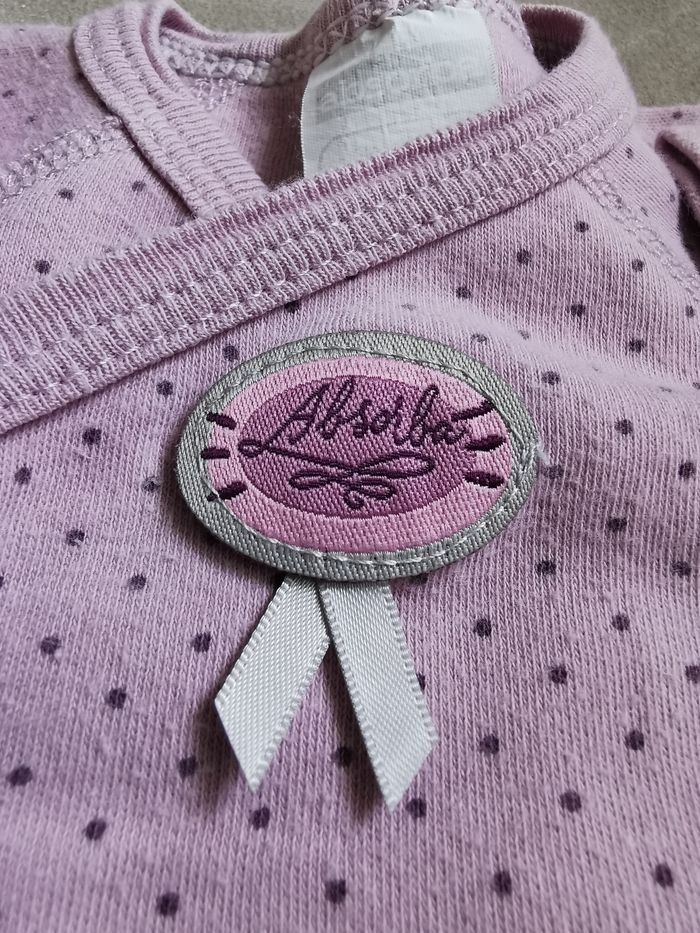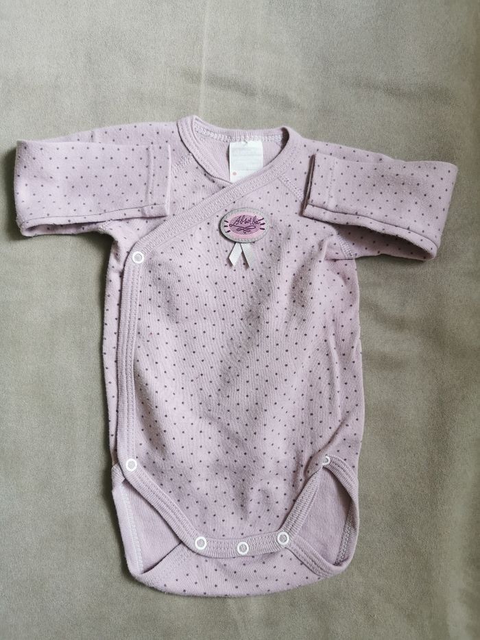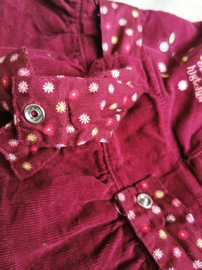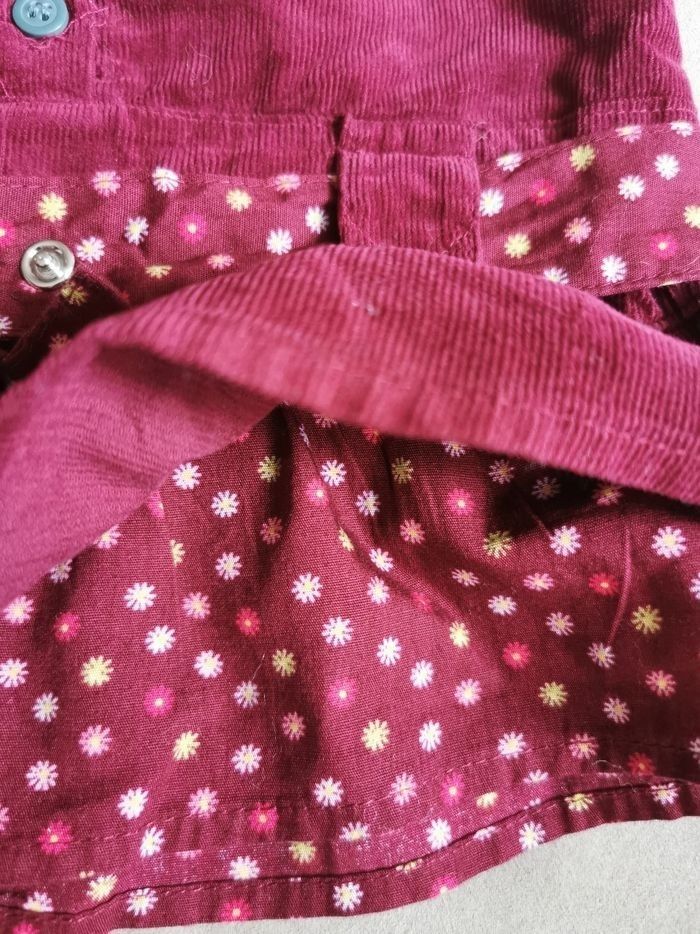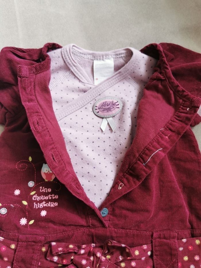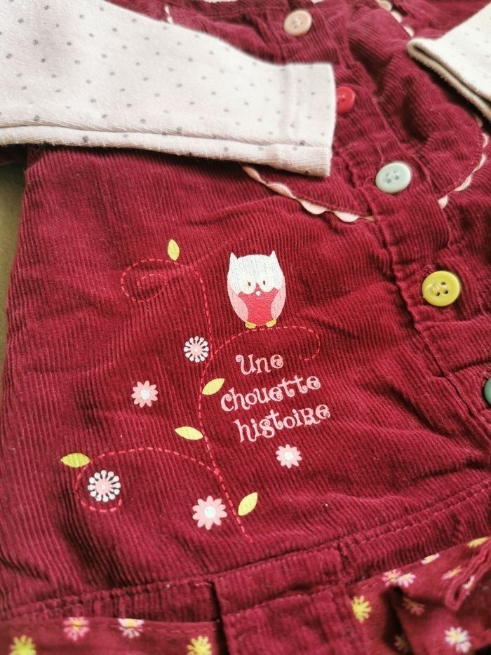 Robe en velours fines côtes bordeaux manches courtes légèrement bouffantes et elastiquée, larges passants pour la ceinture en coton à fleurs assortie amovible par bouton pression. Doublure petit volant à fleurs en bas de la robe, assortie à la ceinture. Détail plastron et print chouette + message. 5 bouton multicolores permettent une large ouverture sur l'avant. Je vous propose en complément un body de la marque Absorba violet à pois forme cache cœur en parfait état, aucune tâche, tous les boutons pression fonctionnels.