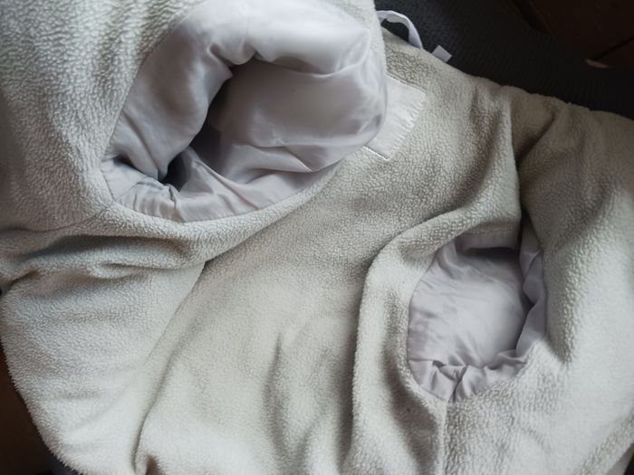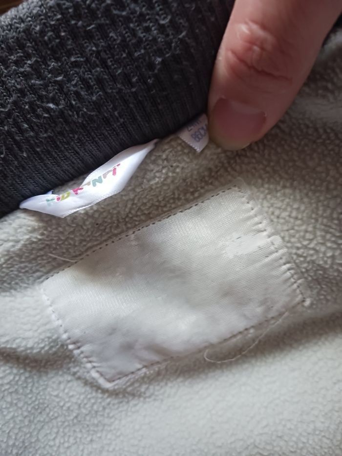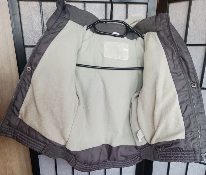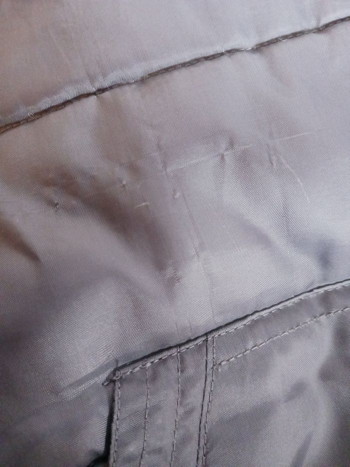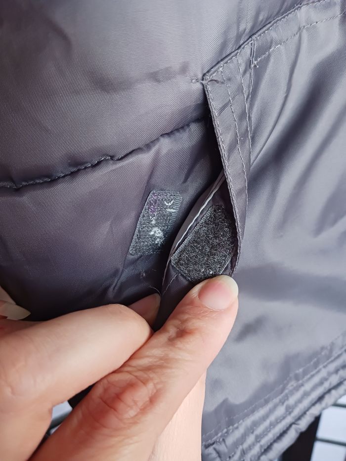 Doudoune molletonnée à l'intérieur sauf au niveau des bras et dans la capuche. Poches qui se ferment avec scratchs. En bon état général, pas de tâches ni trous, juste une imperfection au dessus de la poches voir derniere photo