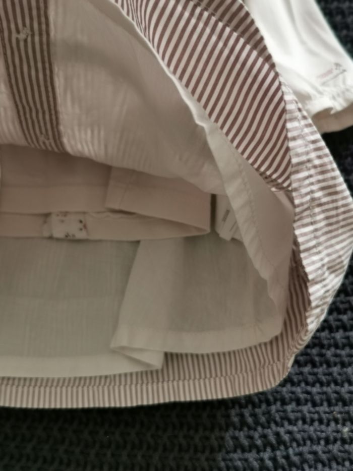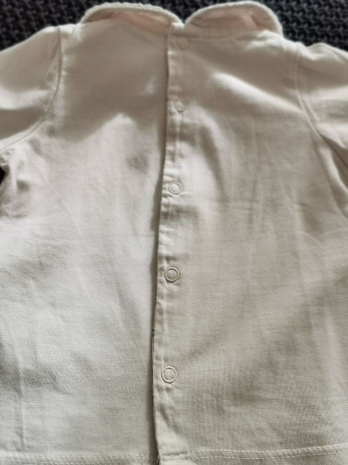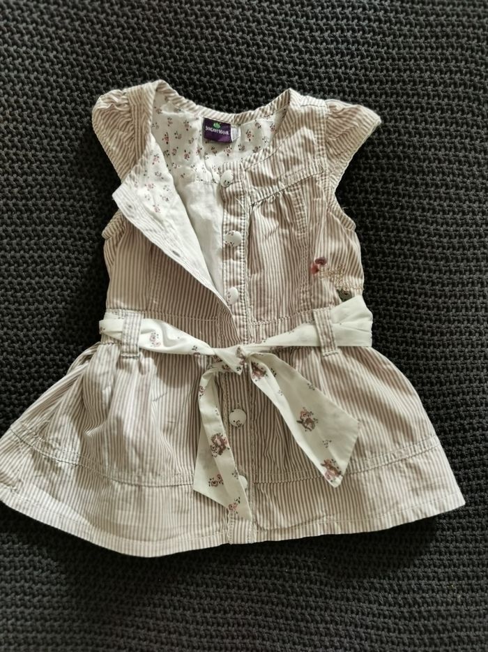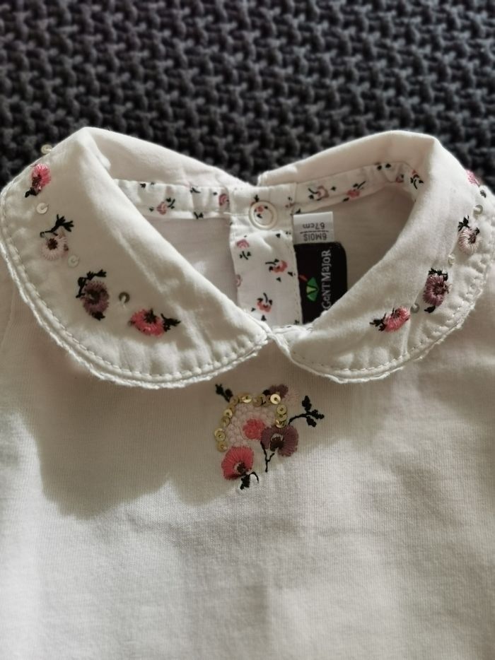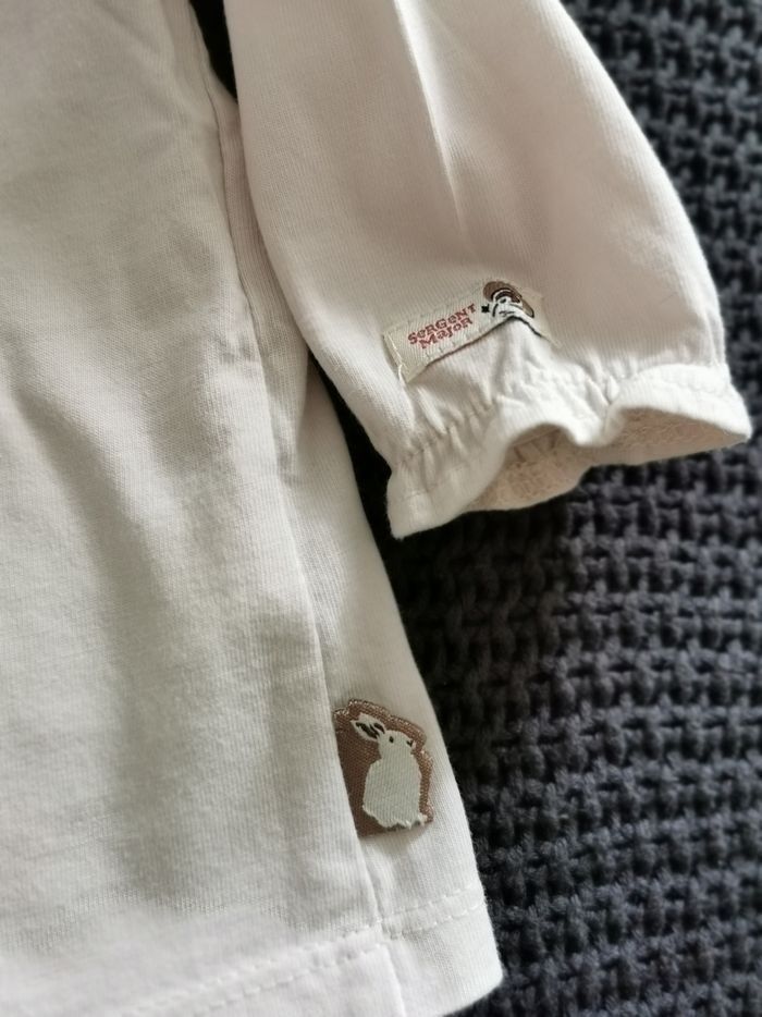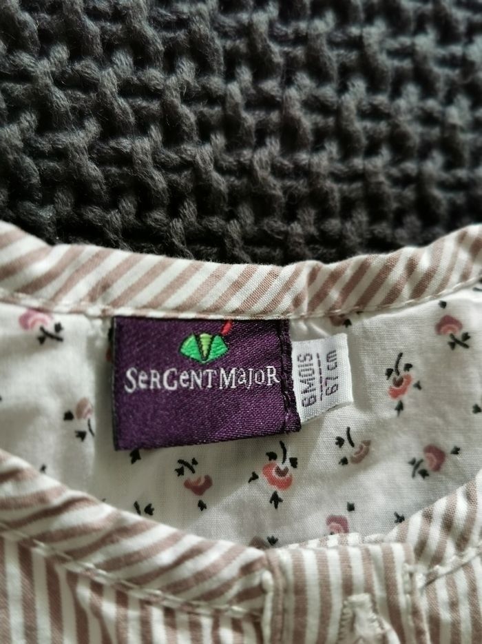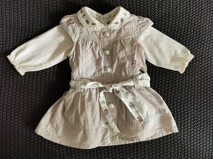 Ensemble Sergent Major composé d'une robe et un t-shirt manches longues. La Robe est de couleur crème à rayures, en percale de coton entièrement deboutonnable et doublée, les boutons sont enrobé de tissu assorti à la ceinture qui est en tissu et amovible. Le t-shirt à col est entièrement deboutonnable dans le dos par boutons pression, les manches sont elastiquées et dispose d'un joli col brodé de fleurs avec des sequins. Une pampille lapin sur le côtés s'ajoute aux nombreux détails comme sait bien faire la marque. Le tout est en très bon état.