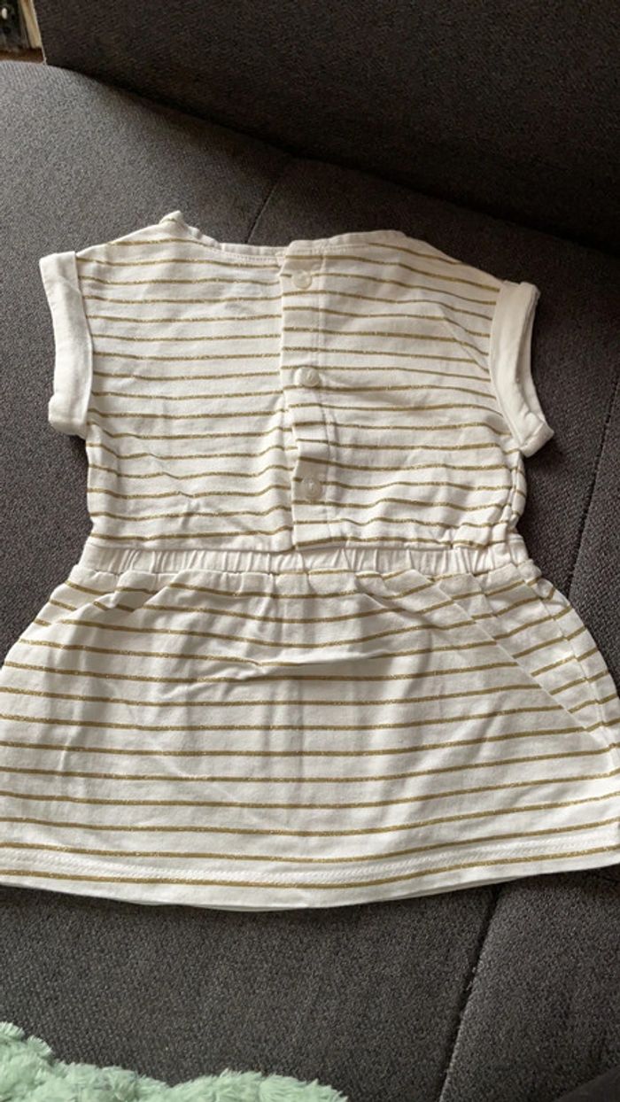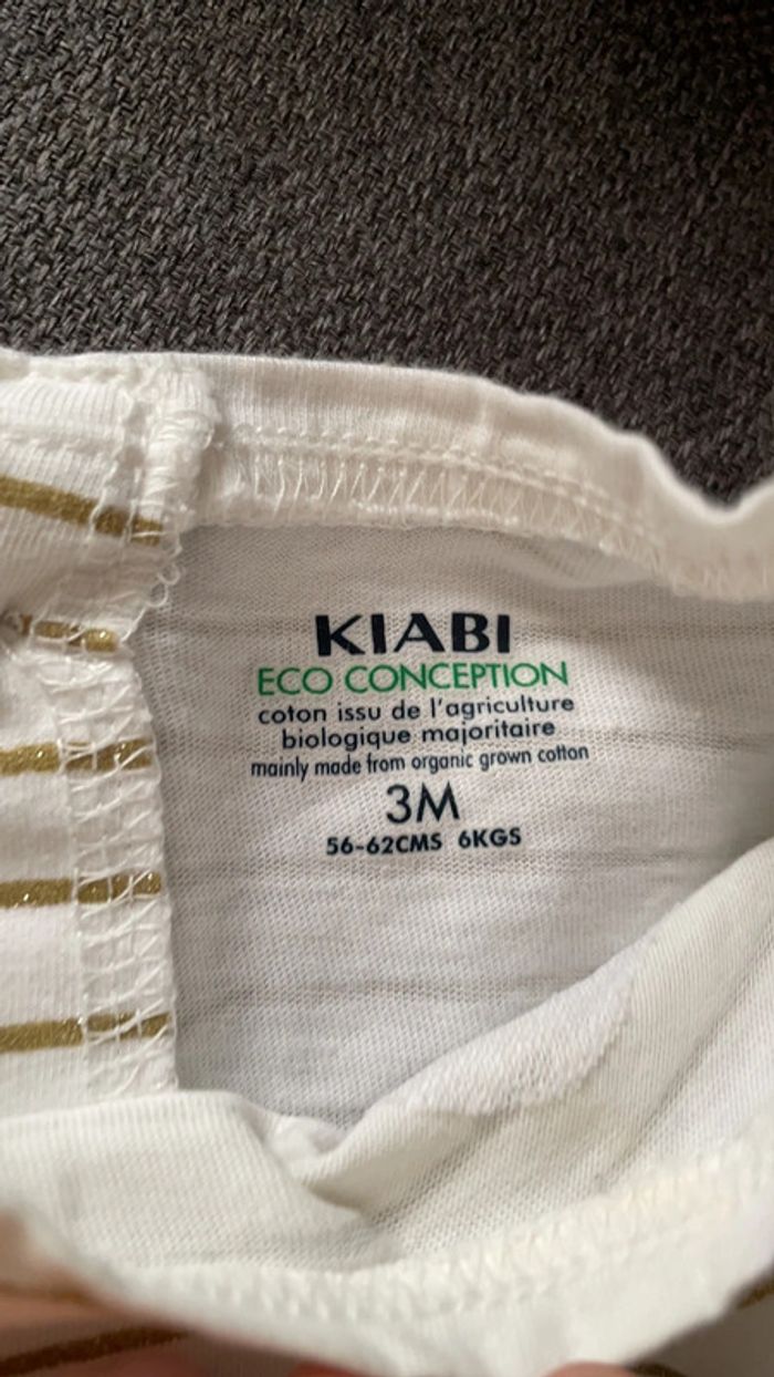 Taille bien. Rayure pailleté or. Trois pressions dans le dos et élastique à la taille. 🎀 Marque : Kiabi 🎀 Taille : 3 mois N’hésitez pas à consulter mon dressing, les promotions sur les lots sont activés ☺️