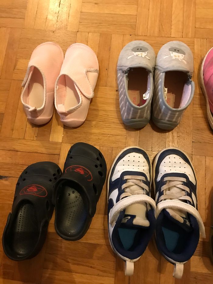 Je vends 7 paires de chaussures en bon état ou état d’usure. Elles sont toutes en 26 sauf les chaussures type crocs en taille 25. La paire de chaussures jaunes et la paire noire sont en cuire. La paire blanche et bleu est de marque Nike Les chaussons roses et les baskets roses sont achetées chez décathlon.