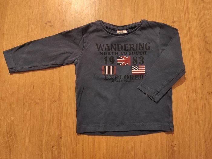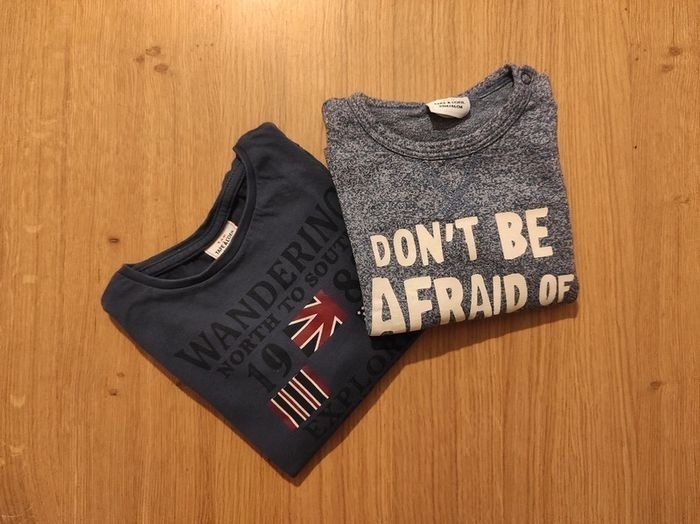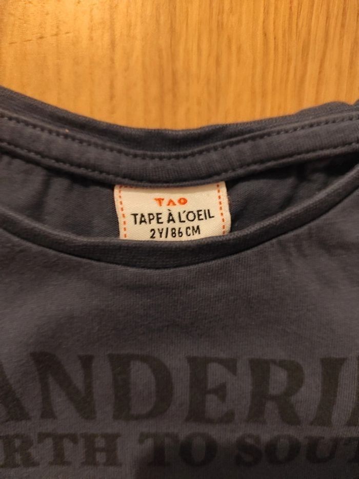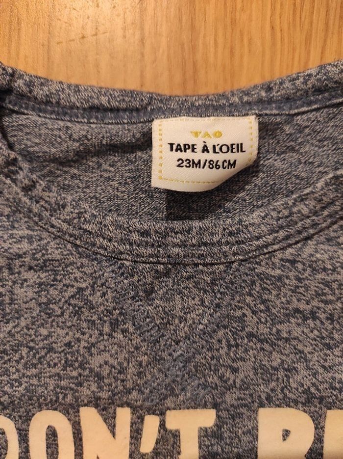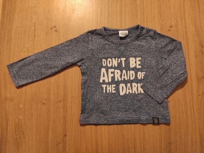 Lot de 2 tee-shirts manches longues TAO en parfait état. Un tee-shirt manches longues bleu foncé, motif à l'avant. Un tee-shirt bleu chiné, impression "Don't be afraid of the dark", phosphorescente dans le noir. Taille 2ans/ 23 mois pour les 2 tee-shirts.