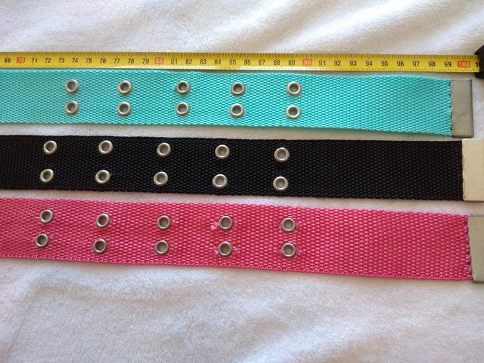 1 lot de 3 ceintures rose, noire, bleu océan 1m hors tout et 3cm 8 mm de largeur voir photos 6 euros le tout Elles sont en tb état. D autres modèles dans mon dressing je peux faire des échanges hésitez pas à me demander. Cordialement.
