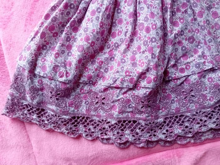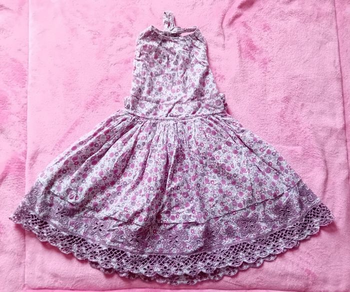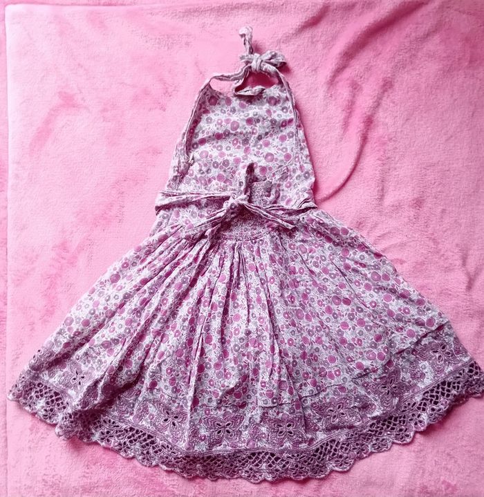 Robe Vertbaudet taille 3 ans en très bon état couleur violet rose et blanc attaché au cou et fermeture sur le côté dos nu avec noeud à la taille