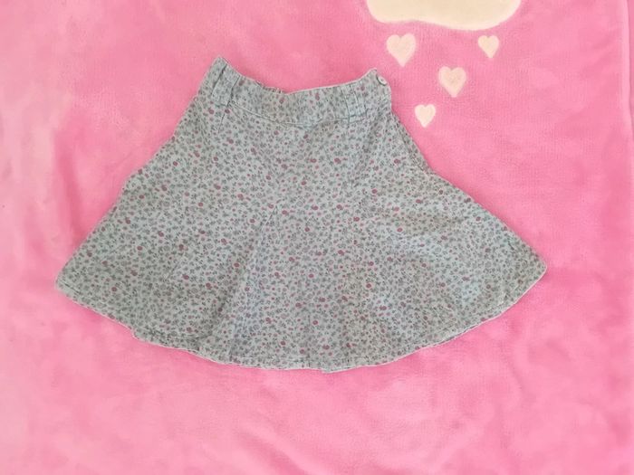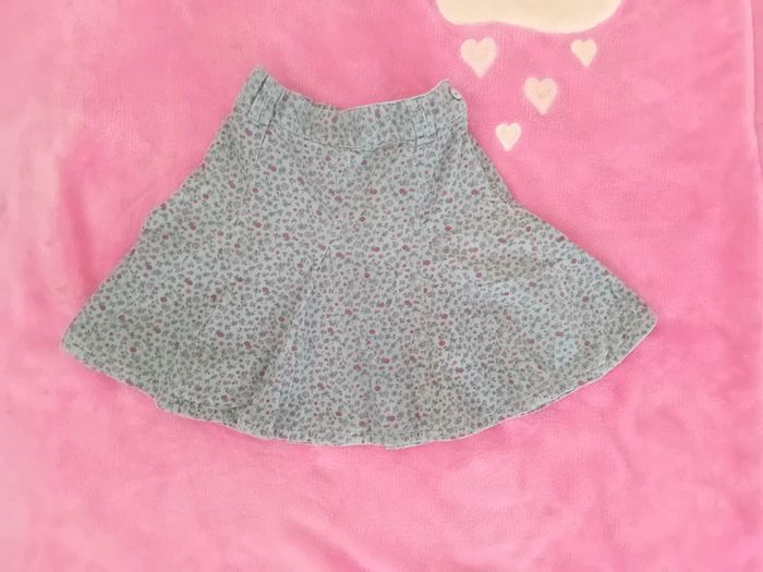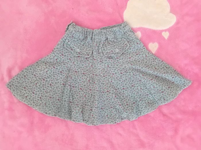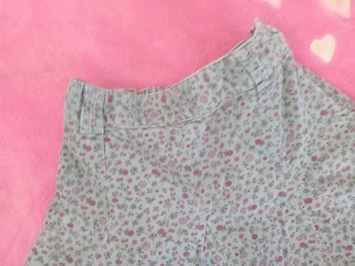 Jupe Sergent Major taille 5 ans en très bon état tissu velour fermeture éclair sur le côté couleur bleu vert et motif rose