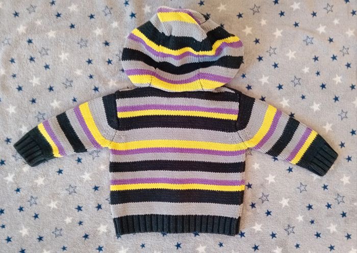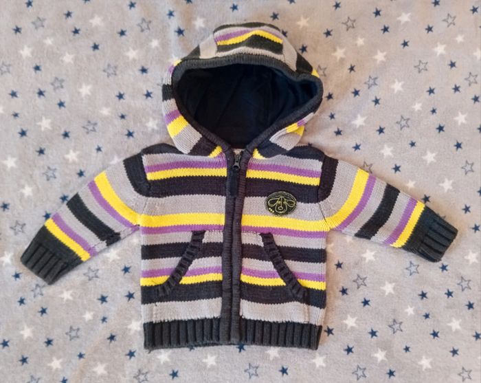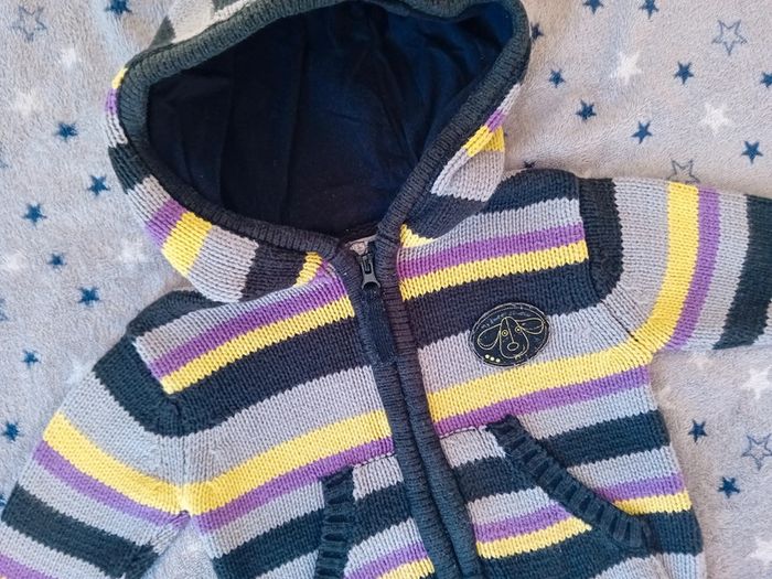 Gilet Orchestra taille 6 mois en très bon état couleur gris jaune et violet à fermeture éclair